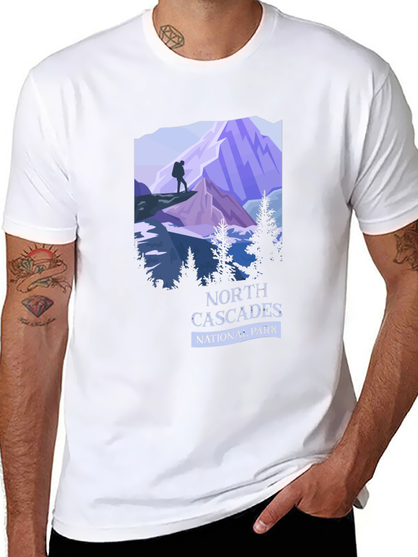 Show your love for the great outdoors with this stylish graphic tee. The black t-shirt features a vibrant image of North Cascades National Park, complete with majestic mountains, lush forests, and a lone hiker admiring the view. The design is printed on a comfortable, soft fabric, perfect for everyday wear. Whether you're planning your next adventure or simply want to express your passion for nature, this tee is an ideal choice. Great for casual outings, hiking trips, or as a thoughtful gift for nature enthusiasts.