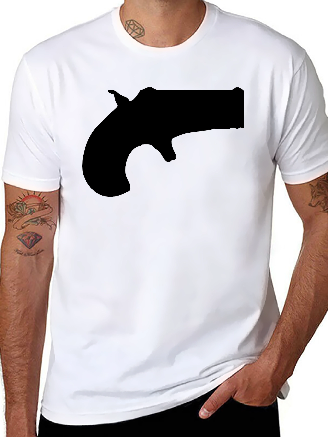 Make a bold statement with this black t-shirt featuring a striking derringer pistol silhouette. Crafted from a comfortable-looking fabric, this tee is ideal for casual wear. The solid black color enhances the gun graphic, creating a design that is both eye-catching and simple. This stylish shirt is perfect for expressing your individual style or as a unique gift for anyone who appreciates bold and edgy designs. Wear it while you hang out with friends or to make a statement at a public event. A cool and distinctive shirt, made for comfort and everyday wear.