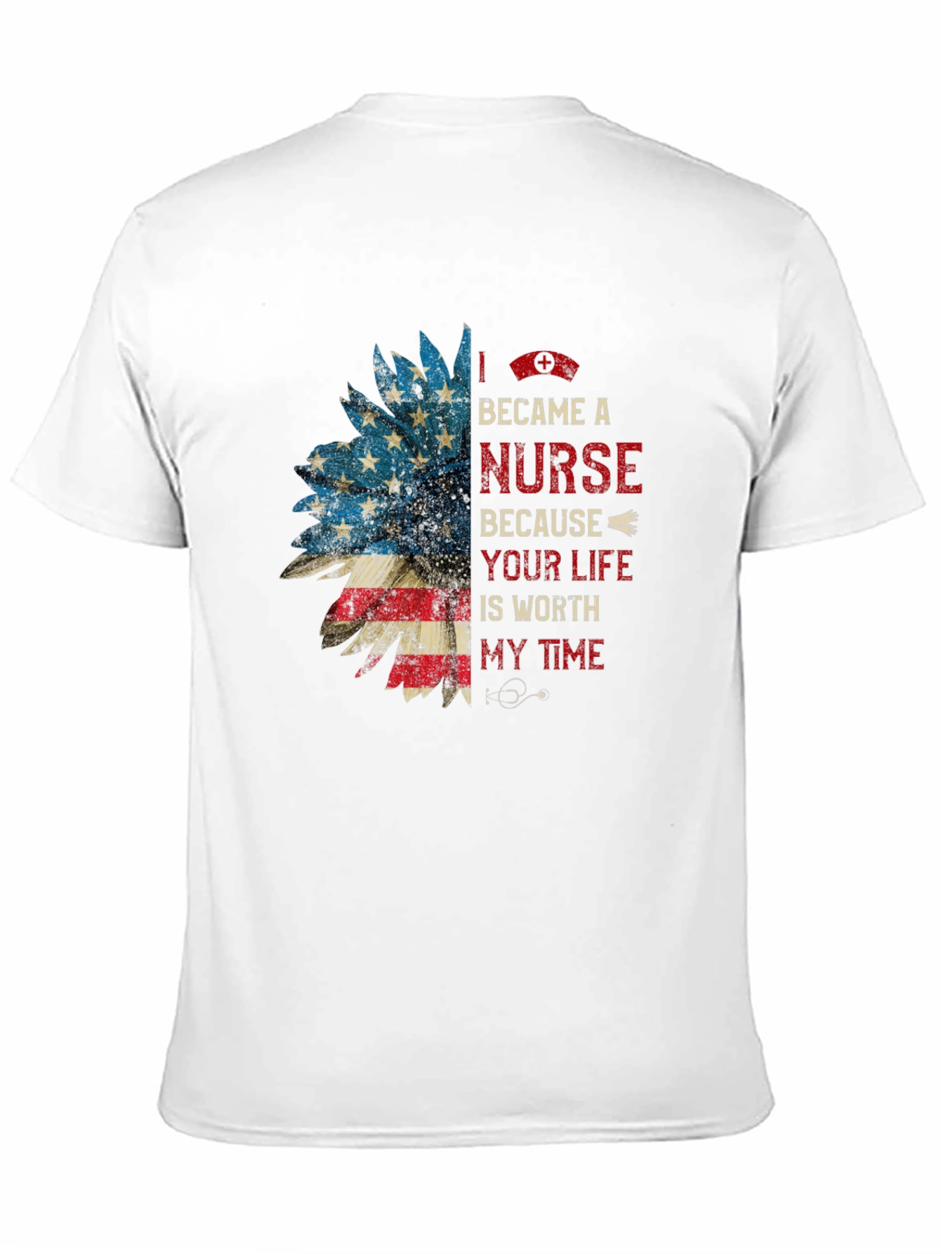 Show your appreciation for nurses with this unique t-shirt! This black tee features a bold graphic that's half sunflower and half American flag. The words "I became a nurse because your life is worth my time" are printed in red, making a powerful statement. Made from soft, breathable fabric, it's comfortable for everyday wear. Perfect for nurses, nursing students, or anyone who wants to support the nursing profession. Wear it to work, school, or casual outings to show your pride and dedication.