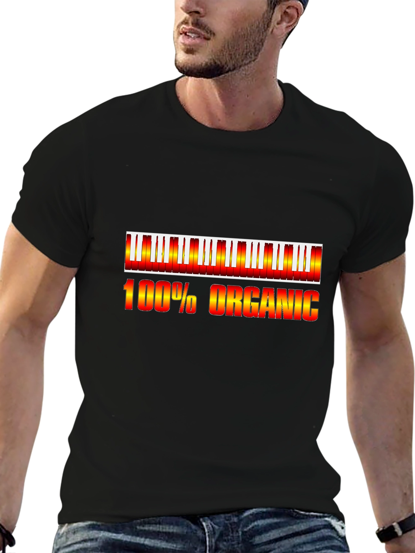 This black t-shirt features a unique design with a stylized piano keyboard graphic and the text "100% Organic" in a vibrant, fire-like gradient. The design is eye-catching and modern, perfect for those who appreciate music and organic living. The shirt appears to be made of a soft, comfortable material, ideal for everyday wear. This tee is perfect for casual outings, concerts, or simply relaxing at home. Show off your unique style and values with this statement piece.