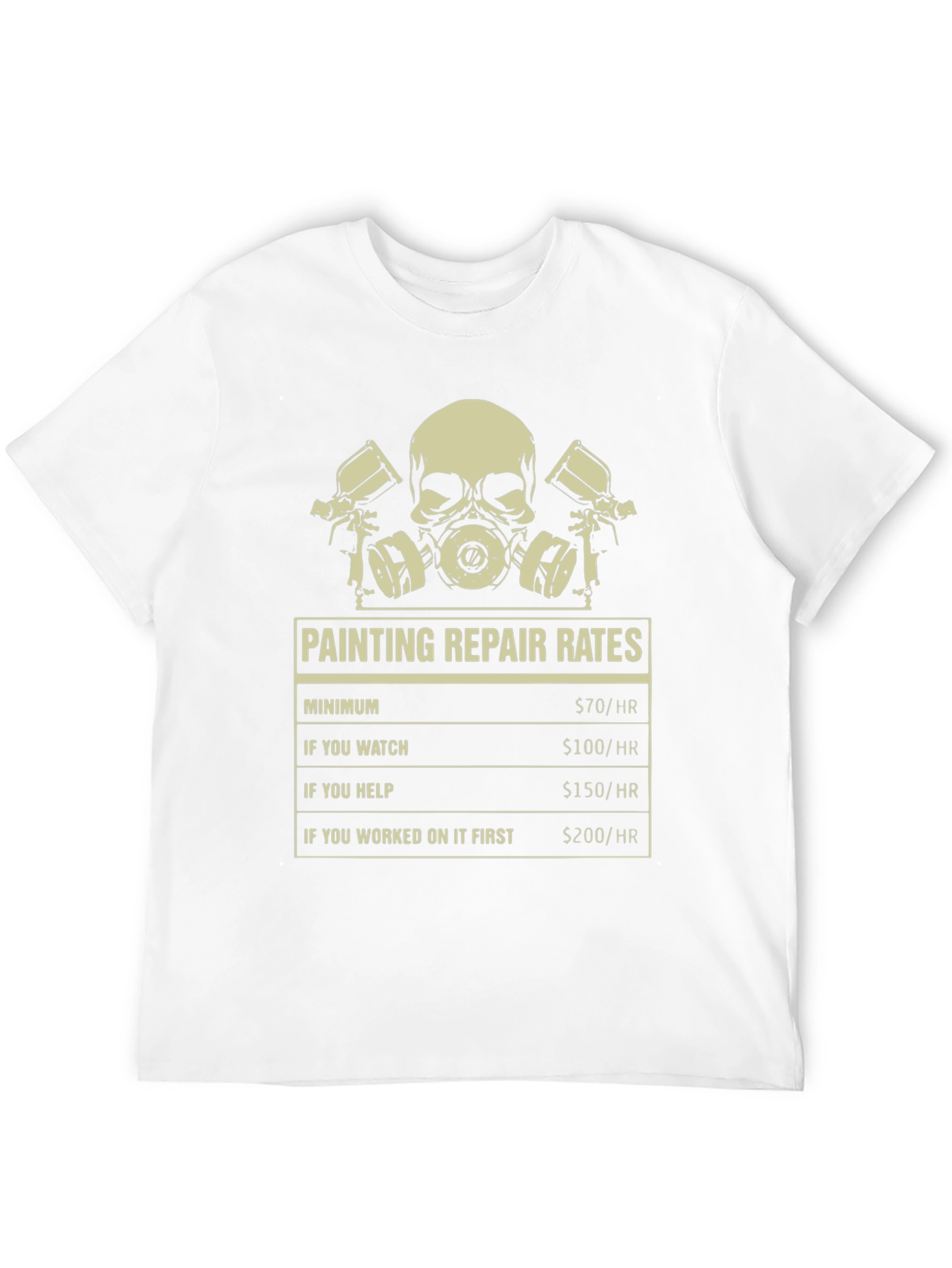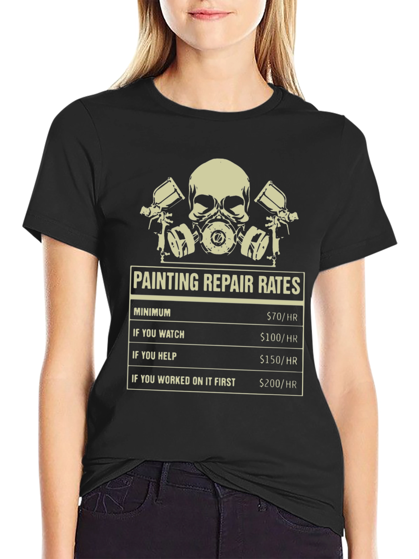 This black t-shirt features a humorous design for painters and repair professionals. The graphic includes a skull with a respirator mask, flanked by paint spray guns, giving it an edgy, cool vibe. Below the graphic, there's a table labeled "PAINTING REPAIR RATES" listing escalating hourly rates depending on customer involvement, implying humorously that the more the customer interferes, the higher the bill. Made from a comfortable-looking fabric, this tee is ideal for casual wear, workwear, or as a gag gift for the professional painter in your life. It's a great conversation starter and expresses a unique sense of humor about the painting trade.