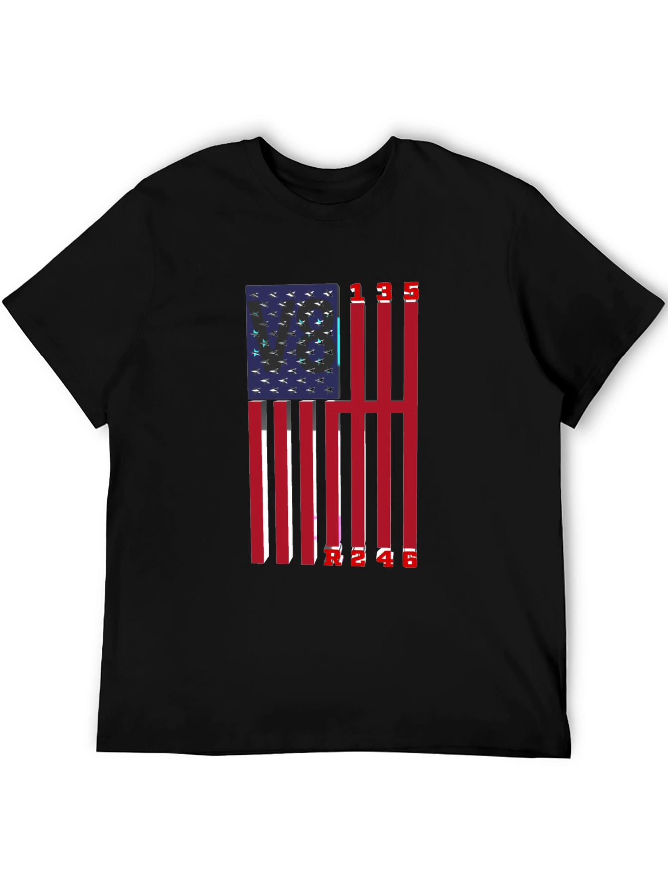 Show your love for the USA with this unique black t-shirt. The design features a stylized American flag with a blue field of stars and red and white stripes. Instead of traditional stripes, some are replaced with the numbers 1-6 in a bold red font. The shirt appears to be made of a comfortable, breathable cotton blend, perfect for everyday wear. This eye-catching design makes a statement and is ideal for casual outings, patriotic holidays, or simply expressing your American pride. Get yours today!