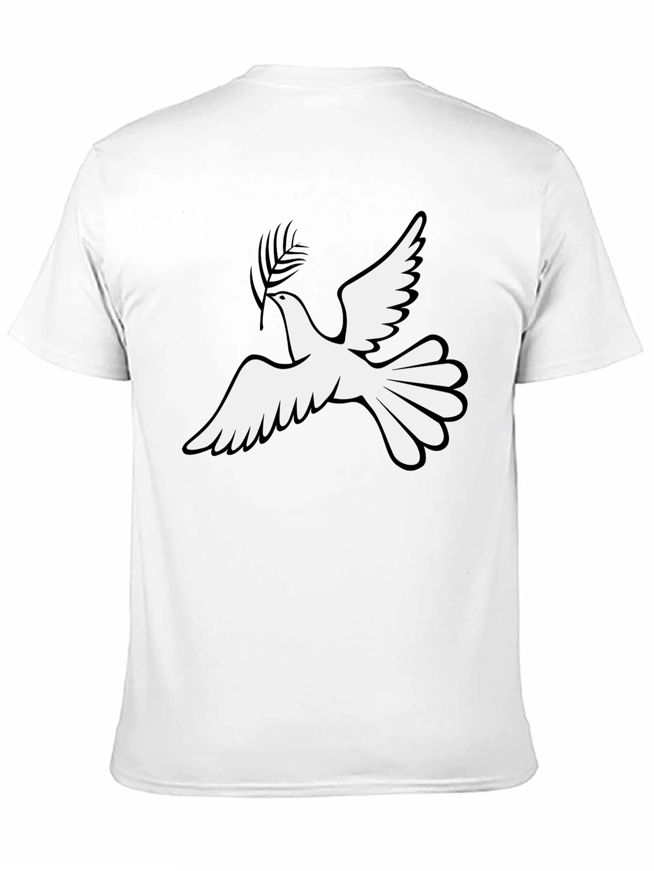 Showcase your style with this sleek black t-shirt featuring a striking white dove graphic. The dove, holding an olive branch, symbolizes peace and freedom. Crafted from a comfortable cotton blend, this shirt is perfect for everyday wear. The high-quality print ensures the design remains vibrant wash after wash. Dress it up with jeans for a casual outing or pair it with shorts for a relaxed summer vibe. The classic fit makes it suitable for all body types, offering both comfort and style. Add a touch of symbolic artistry to your wardrobe with this unique tee!