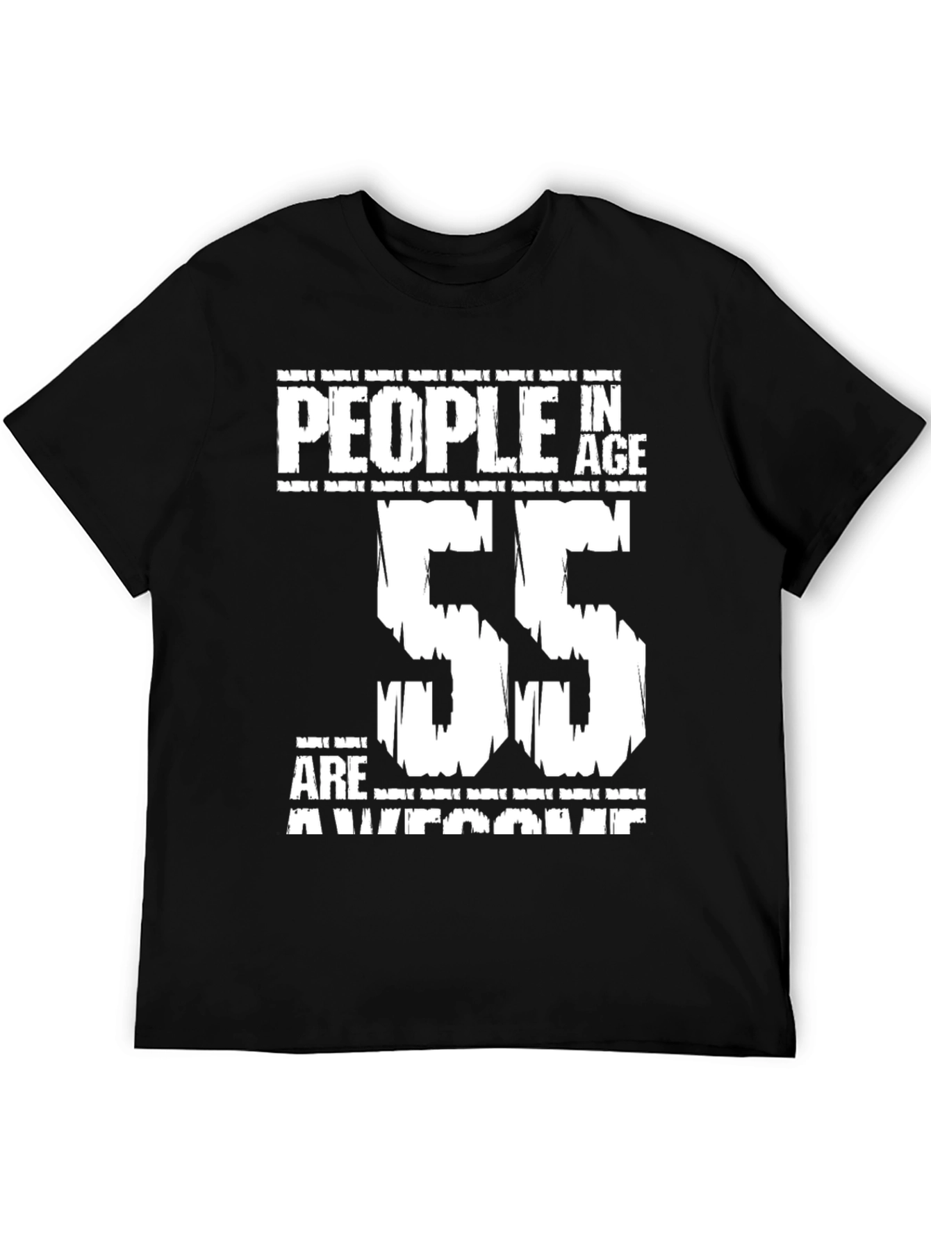 Show off your witty side with this bold, black t-shirt featuring the statement 'People in Age 55 are Awesome'. This eye-catching tee is designed for comfort and style, with a classic fit that flatters all body types. The crisp white text pops against the dark fabric, ensuring your message is seen and appreciated. Ideal for casual outings, birthday celebrations, or simply expressing your awesome self. Whether you're turning 55 or know someone who is, this t-shirt makes a perfect gift to celebrate this milestone age with humor and pride. Wear your awesomeness!