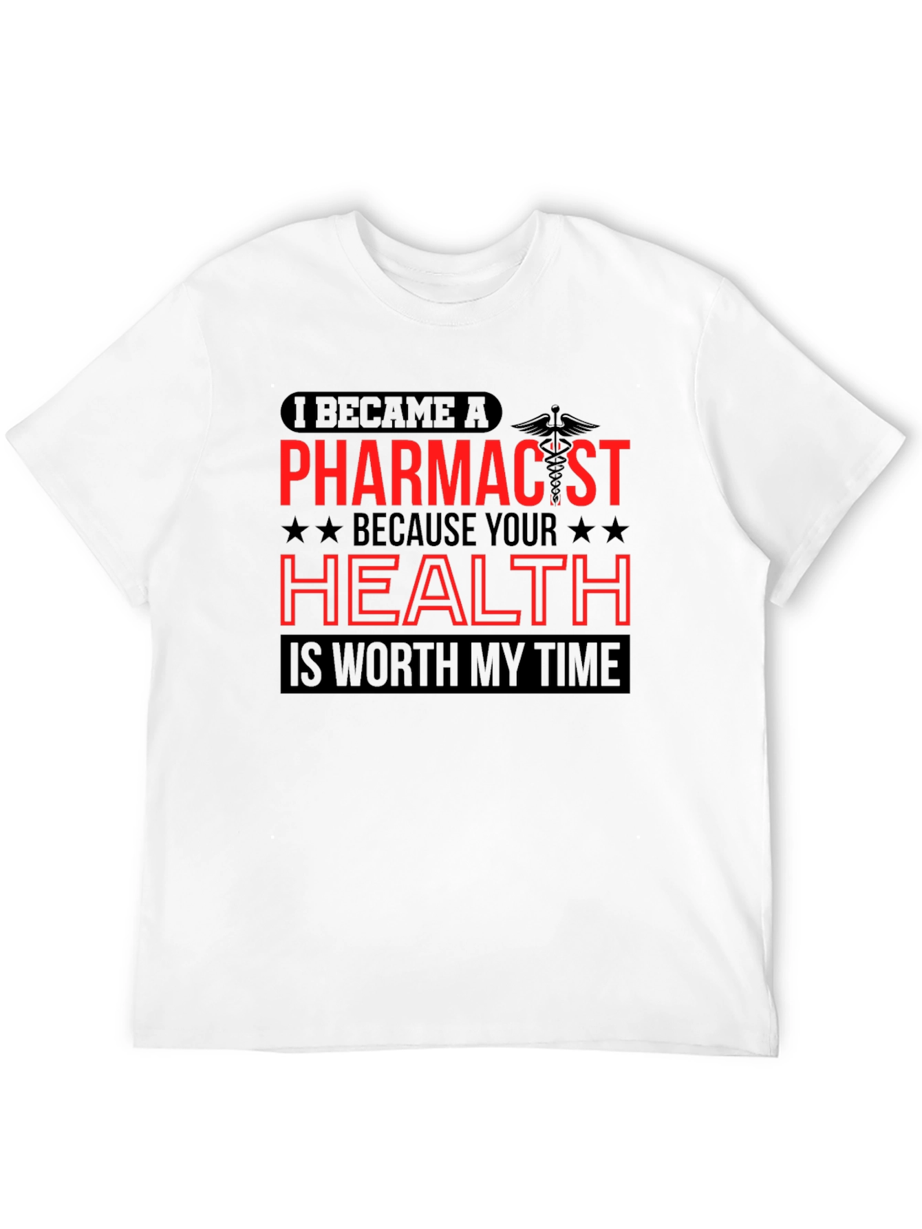 Show your appreciation for pharmacists with this striking black t-shirt. Featuring a bold design in red, the shirt proclaims, "I BECAME A PHARMACIST BECAUSE YOUR HEALTH IS WORTH MY TIME". The graphic includes a medical symbol, adding a professional touch. This classic fit tee is perfect for everyday wear, pharmacy staff appreciation day, or casual outings. It makes a thoughtful gift for the dedicated pharmacist in your life. Comfortable and stylish, it's a great way to celebrate the important role pharmacists play in our health and well-being. Express your passion for your profession with this unique tee!