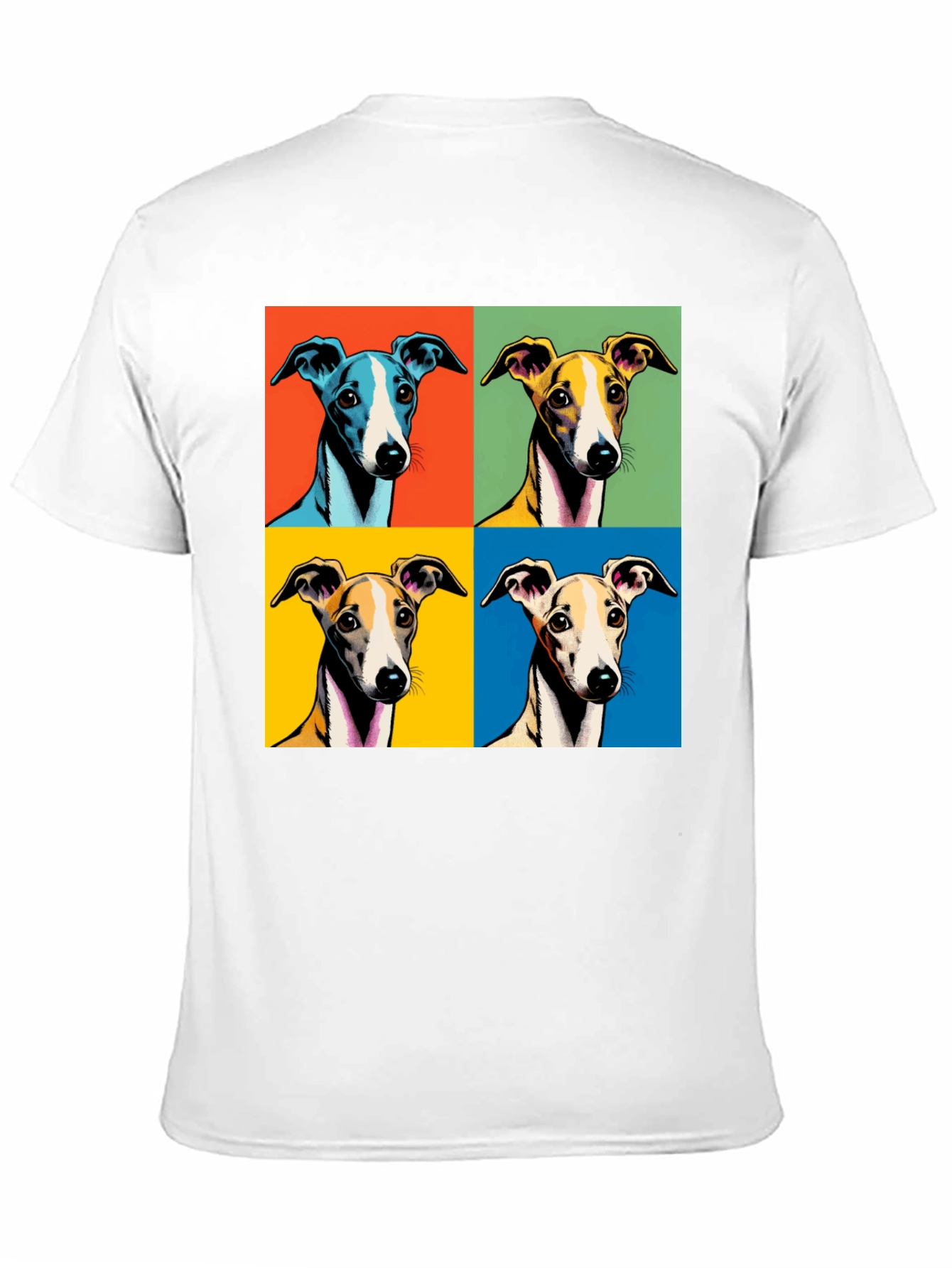 Showcase your love for Greyhounds with this unique pop art T-shirt. The design features four Greyhound portraits in a vibrant, colorful square format reminiscent of classic pop art. Printed on a comfortable black cotton blend, this T-shirt is ideal for casual wear, dog walks, or any occasion where you want to make a stylish statement. The eye-catching design is sure to turn heads and spark conversation. A must-have for any Greyhound enthusiast, this T-shirt combines comfort, style, and a playful artistic flair. It's more than just a shirt; it's a wearable piece of art.
