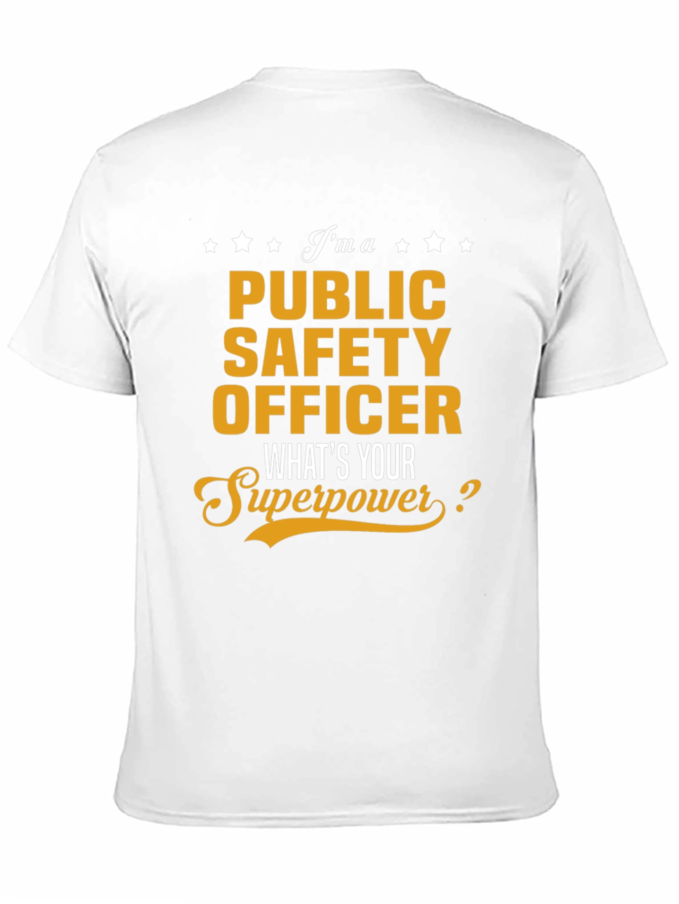 Showcase your dedication with this black t-shirt featuring a bold design! The shirt proudly declares "I'm a Public Safety Officer" in bright gold lettering, followed by the playful question, "What's Your Superpower?" also in gold. Ideal for everyday wear, community events, or as a thoughtful gift for a public safety professional. This eye-catching design makes a statement about your commitment to service. Wear it with pride and let everyone know you're a real-life hero! The classic fit ensures comfort and style. Make a statement and spark conversations with this unique and empowering tee.