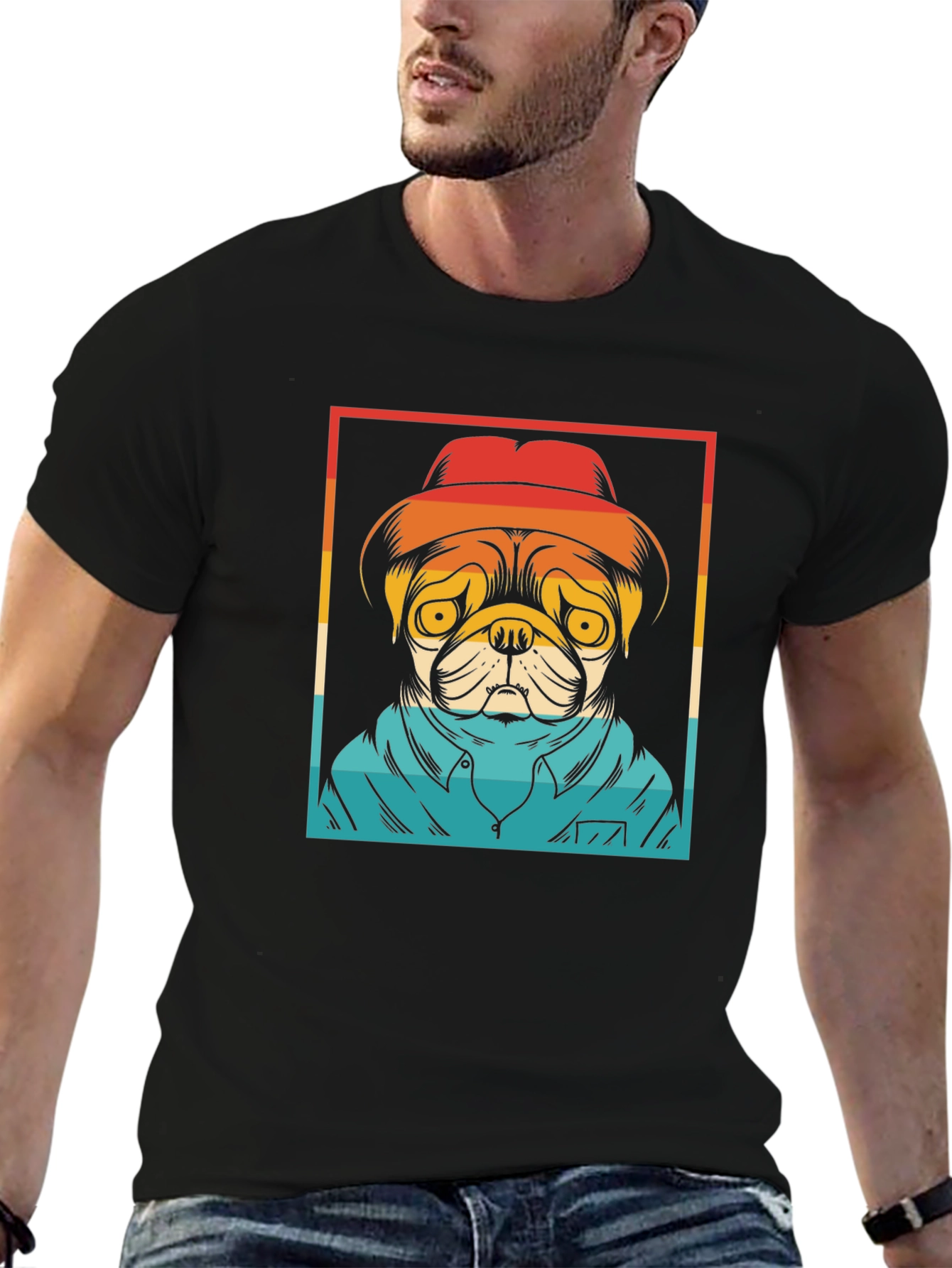 Elevate your casual style with this unique black t-shirt featuring a retro-style graphic of a pug. The design showcases a charming pug dressed in a stylish hat and shirt, all set within a vintage-inspired color block frame. Made from soft, breathable fabric, this tee offers both comfort and durability for everyday wear. Its distinctive design is perfect for adding a touch of personality to any outfit. Whether you're a dog lover or simply appreciate eye-catching graphics, this t-shirt is sure to become a favorite in your wardrobe. Ideal for casual outings, weekend adventures, or relaxed evenings at home.
