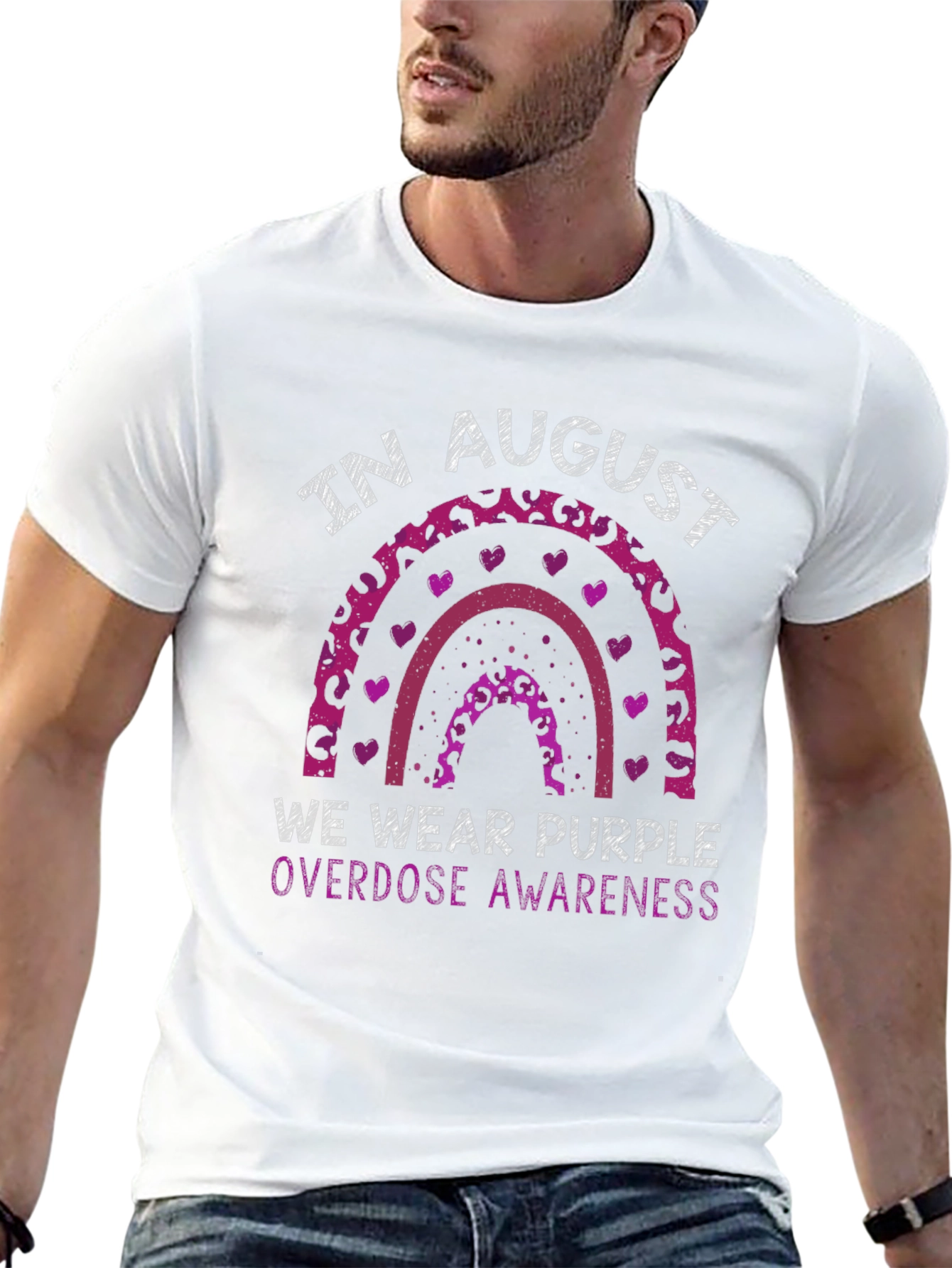 Show your support with this unique Overdose Awareness T-shirt. Featuring a vibrant purple rainbow design with leopard print accents and hearts, this shirt promotes awareness in style. The text "In August We Wear Purple Overdose Awareness" is prominently displayed. Made from a comfortable, breathable fabric, this tee is perfect for awareness walks, support groups, or everyday wear. Wear it proudly and help spread the word to support the cause.