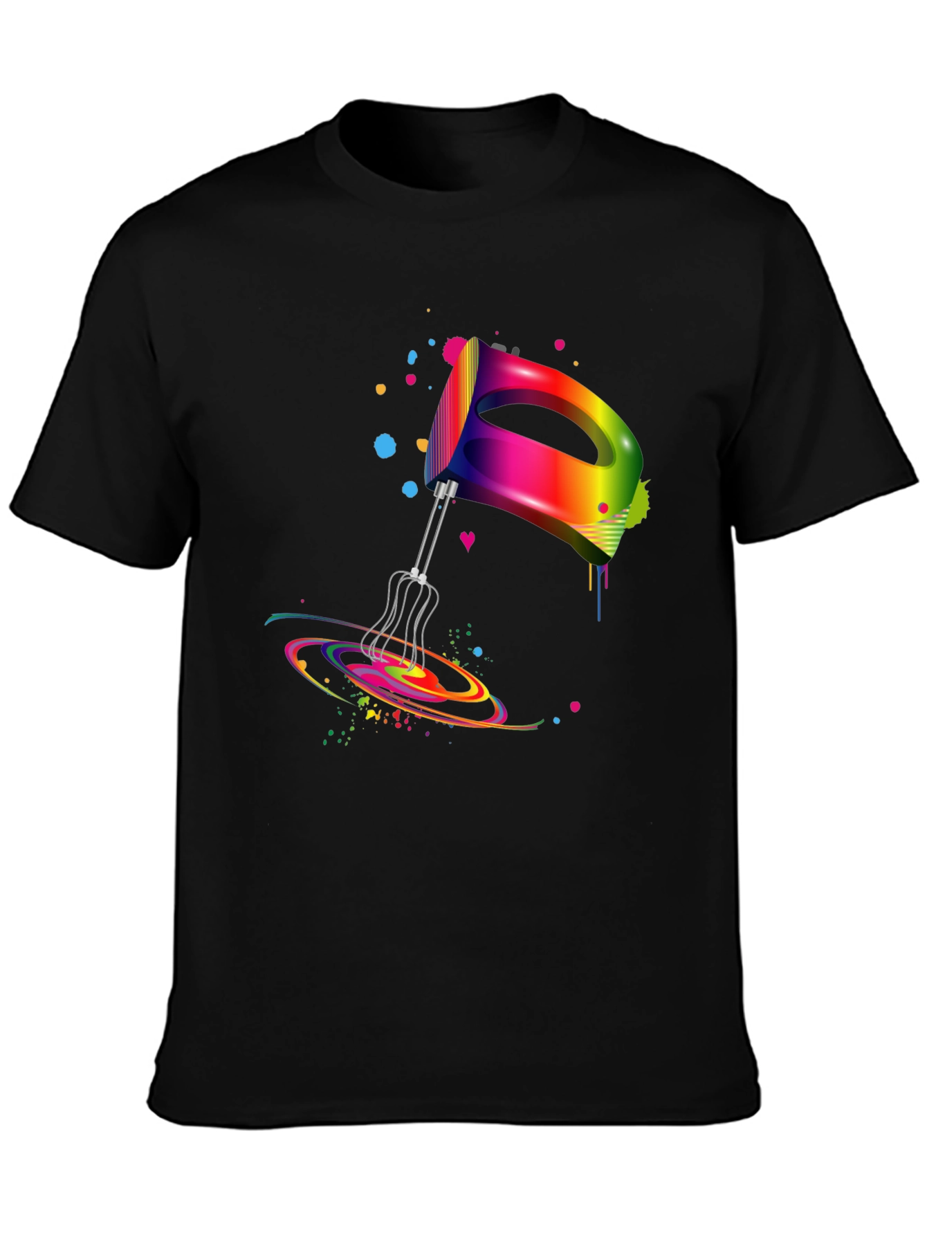 Add a splash of color to your wardrobe with this vibrant graphic tee. The shirt features a colorful, abstract design of a stand mixer, complete with rainbow hues and artistic splatters. This eye-catching design is printed on a comfortable, classic-fit black t-shirt. Made from soft, breathable fabric, this tee is perfect for everyday wear. Show off your love for baking or simply enjoy the playful, artistic design. This shirt is a great conversation starter and a unique addition to any casual outfit. Pair it with jeans, shorts, or a skirt for a fun and stylish look.
