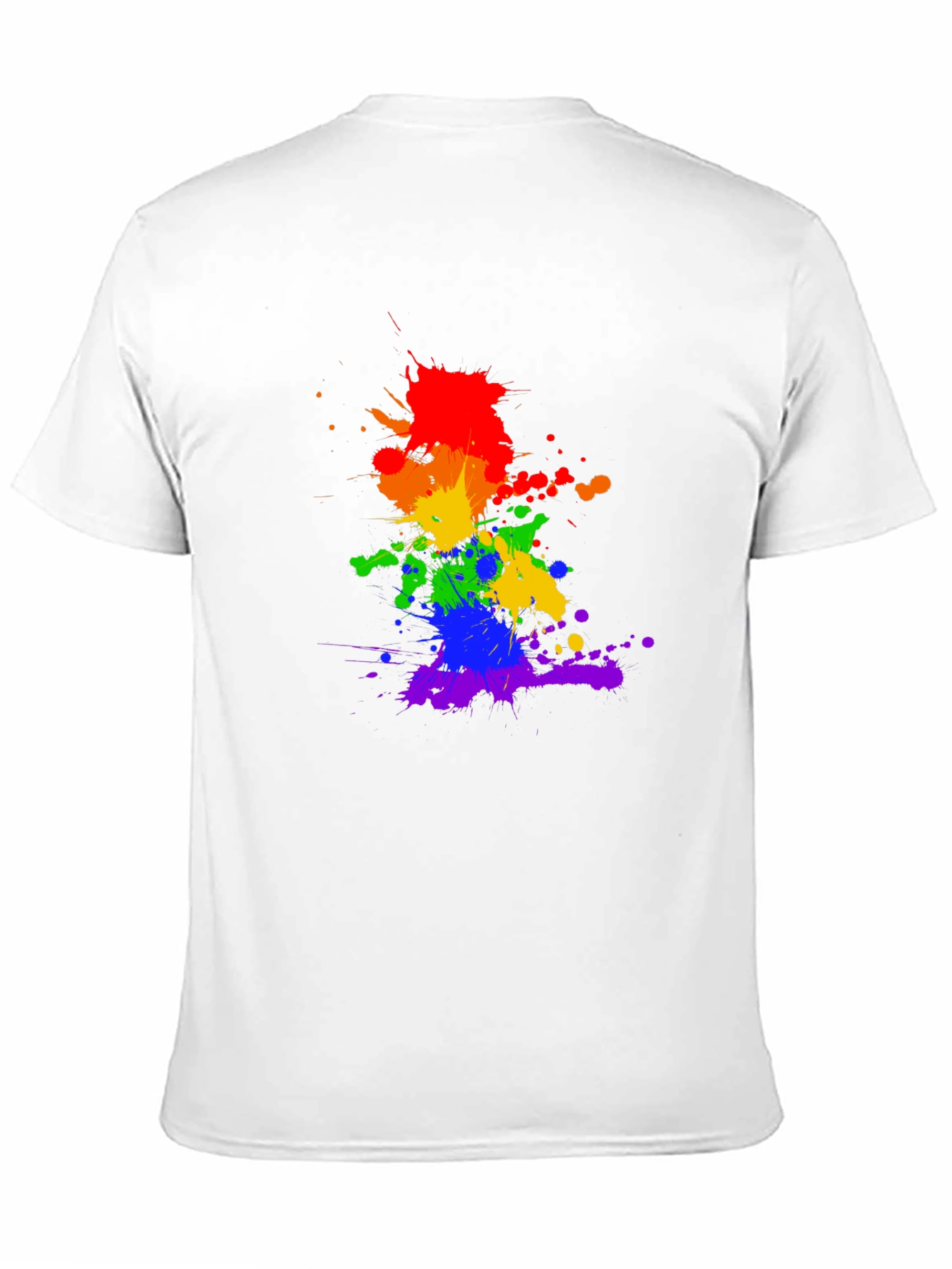 Make a statement with this vibrant black t-shirt featuring a unique rainbow splatter design. The artistic splash of colors, from red and orange to green, blue, and purple, creates an eye-catching visual. Made from what appears to be a soft, breathable cotton blend, this tee offers both comfort and style. The classic crew neck and short sleeves make it versatile for everyday wear. Perfect for expressing your individuality or showing your support, this shirt is sure to turn heads. Wear it casually with jeans or dress it up with a blazer for a more stylish look.