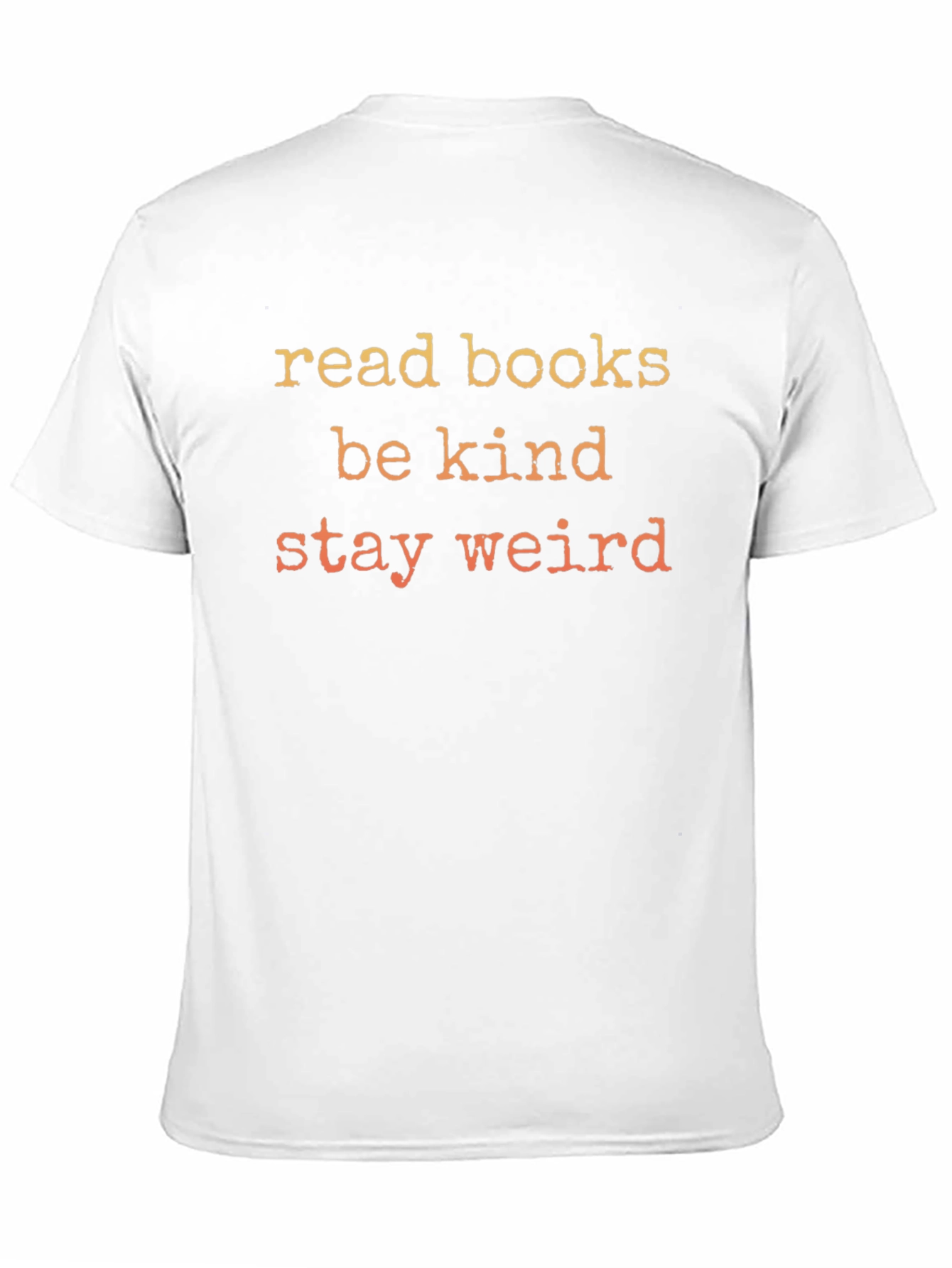This black t-shirt features the phrase "read books, be kind, stay weird" in a retro-inspired font. The phrase is displayed in a gradient of warm colors. It is a comfortable and casual garment. This unique tee is perfect for book lovers, introverts, and people that value kindness and individuality! The classic fit and soft fabric make it ideal for everyday wear, book clubs, casual outings, or simply lounging at home. Show off your unique style with this comfortable t-shirt!
