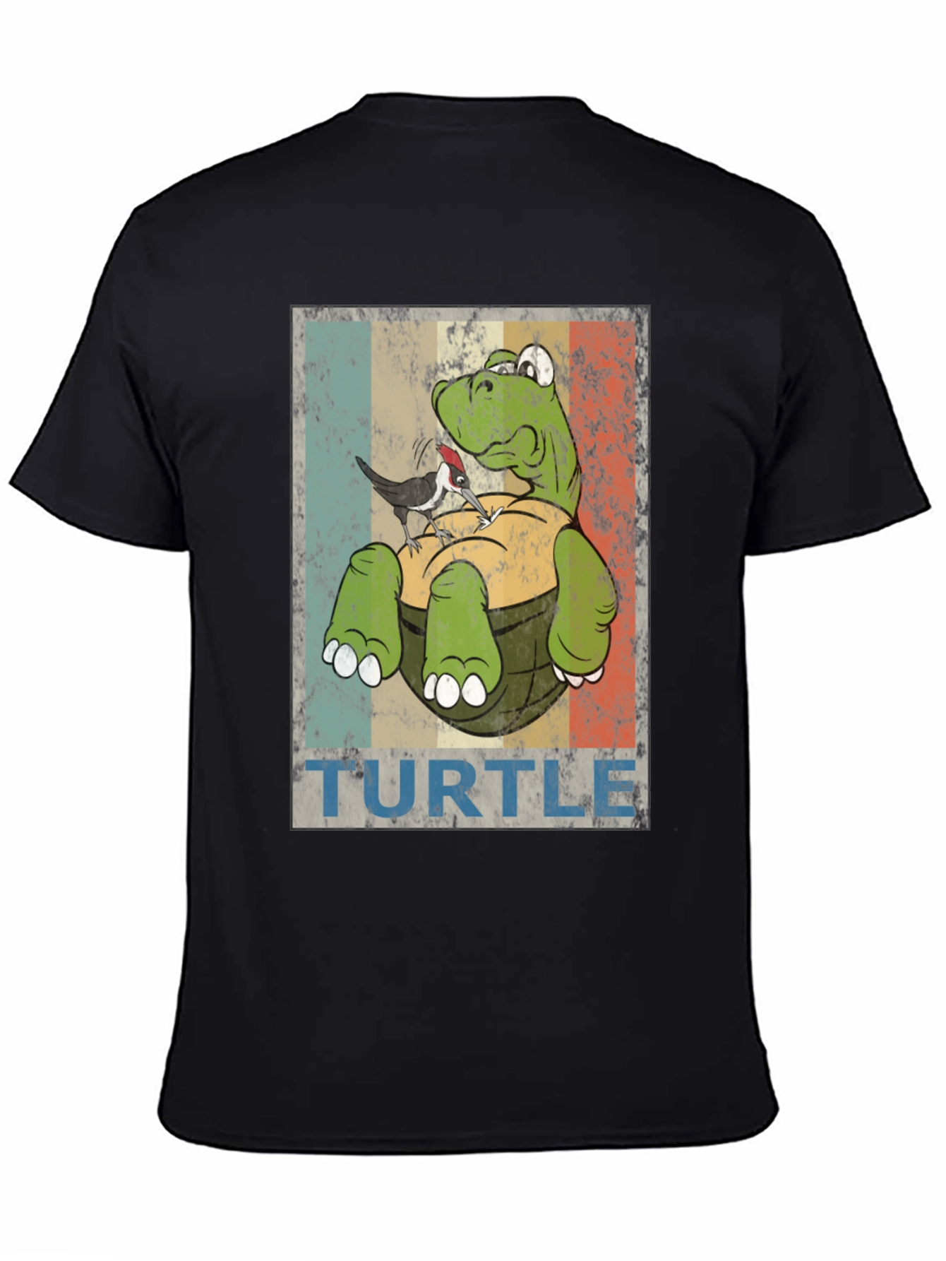 Show off your quirky side with this eye-catching black t-shirt featuring a vintage-style graphic. The design showcases a cartoon turtle with a bird perched on its shell, set against a backdrop of muted stripes. The word "TURTLE" is printed below the image in a distressed blue font, adding to the retro aesthetic. Made from comfortable, breathable fabric, this tee is perfect for everyday wear. Dress it up with jeans and sneakers for a casual yet stylish look, or pair it with shorts for a laid-back weekend vibe. A unique statement piece that's sure to spark conversation!