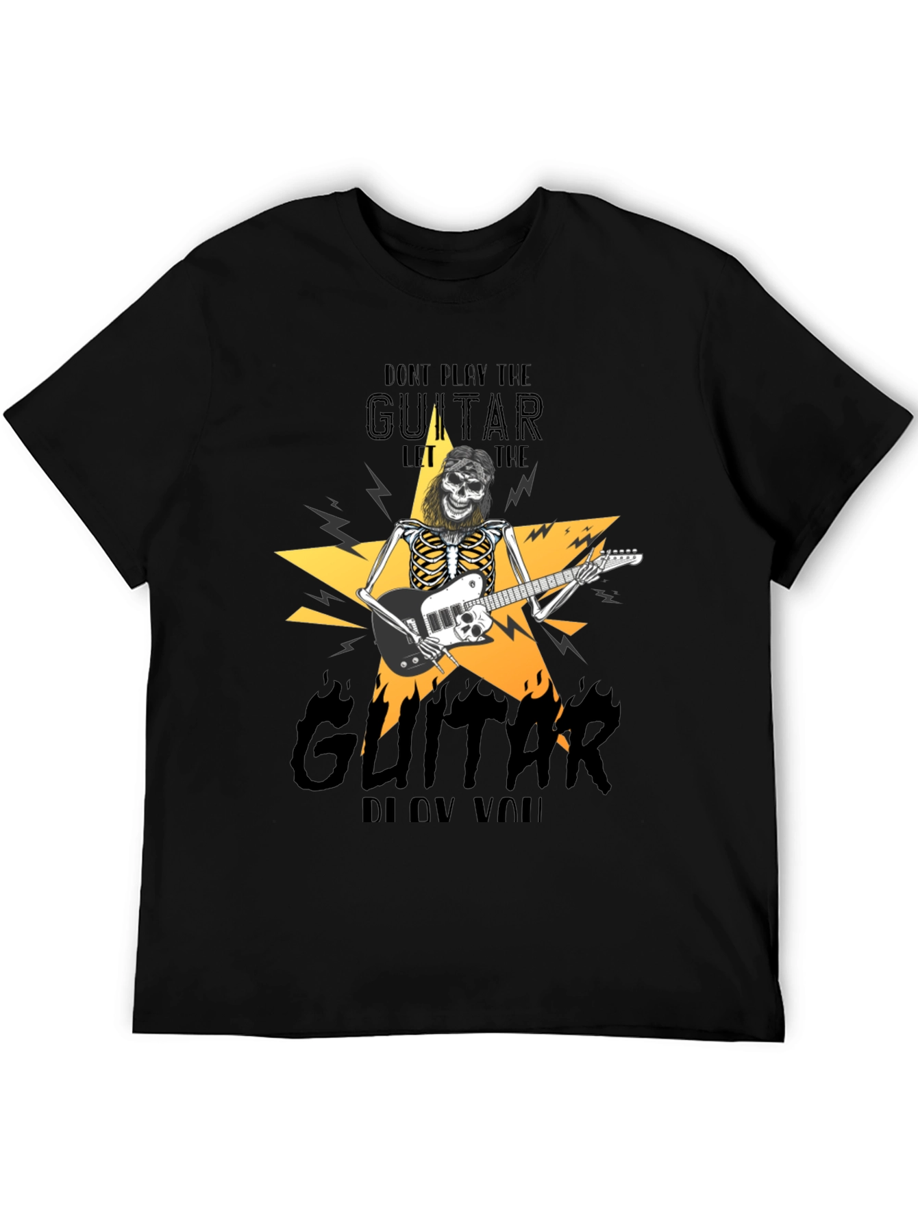 Unleash your inner rock star with this edgy black t-shirt. Featuring a bold graphic of a skeleton shredding on a guitar in front of a vibrant star, this shirt is perfect for music lovers. The design includes electrifying details and fiery accents that add a unique flair. Made from comfortable material, it's ideal for concerts, casual wear, or making a statement. Let the guitar blow you away with this standout piece.