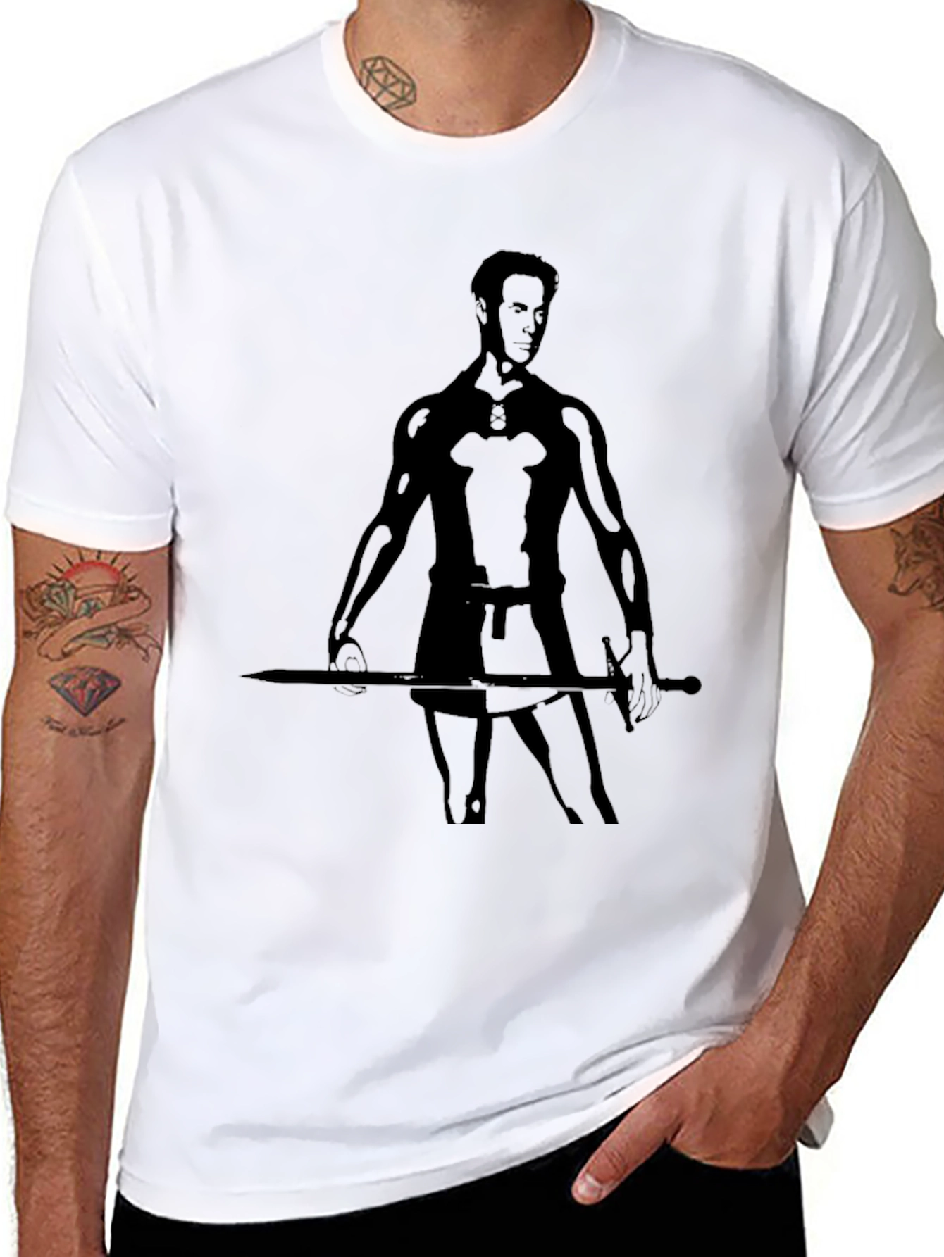 Showcase your inner warrior with this striking men's black t-shirt. The shirt features a bold silhouette graphic of a strong warrior, sword in hand. This unique design makes a statement. Made from comfortable, breathable fabric, this tee is perfect for everyday wear. Dress it up with jeans for a casual night out, or keep it simple with shorts for a relaxed weekend look. The classic fit ensures a flattering silhouette for all body types. Stand out from the crowd and embrace your strength with this eye-catching warrior t-shirt. A must-have for those who appreciate unique and stylish apparel.