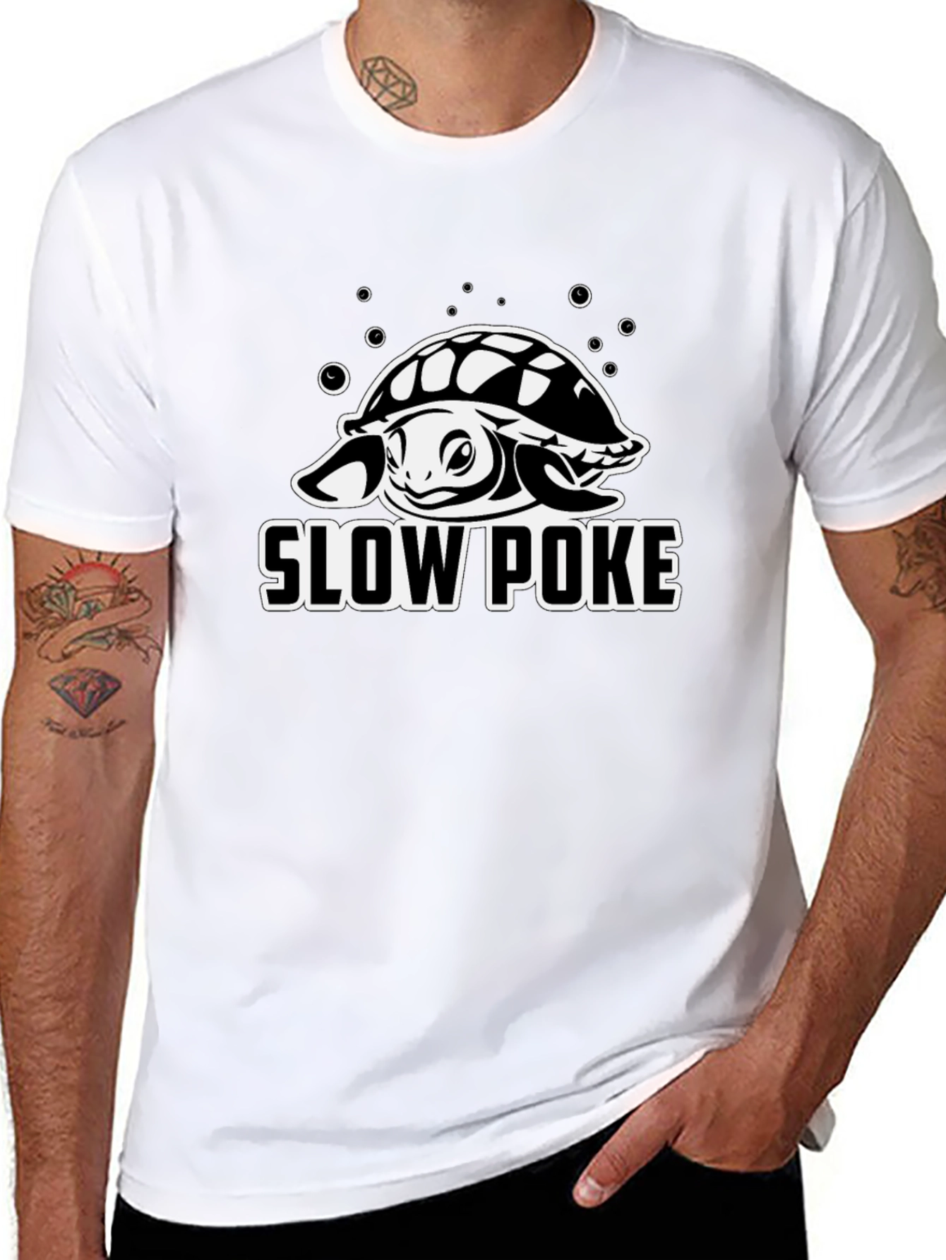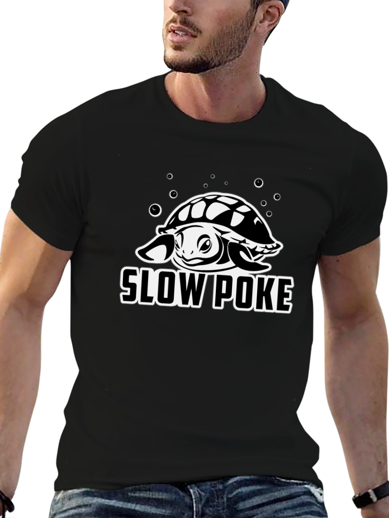Show off your love for the ocean with this unique Slow Poke Turtle T-Shirt. This black t-shirt features a whimsical graphic of a turtle surrounded by bubbles, above the words "SLOW POKE." The design is a clean white print that makes the image pop, creating a fun and eye-catching statement. Made from a comfortable, breathable fabric, this tee is perfect for everyday wear, whether you're heading to the beach, hanging out with friends, or just lounging around the house. Get ready to spread some smiles with this conversation-starting t-shirt!