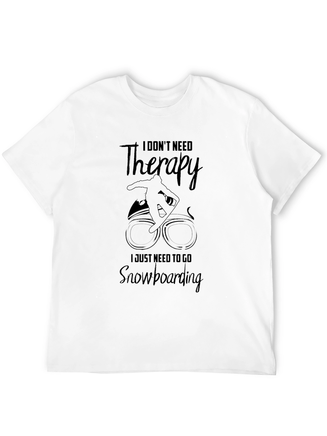 This classic black t-shirt features a humorous and relatable graphic. It displays the phrase "I DON'T NEED Therapy, I JUST NEED TO GO Snowboarding." This shirt appears to be made of soft, comfortable cotton, perfect for casual wear. The design is clean and simple, making it a versatile addition to any wardrobe. It's a great gift for snowboarding enthusiasts, offering a lighthearted take on self-care. Wear it to the slopes, around town, or while relaxing at home. Ideal for anyone who finds solace and joy in shredding the slopes!
