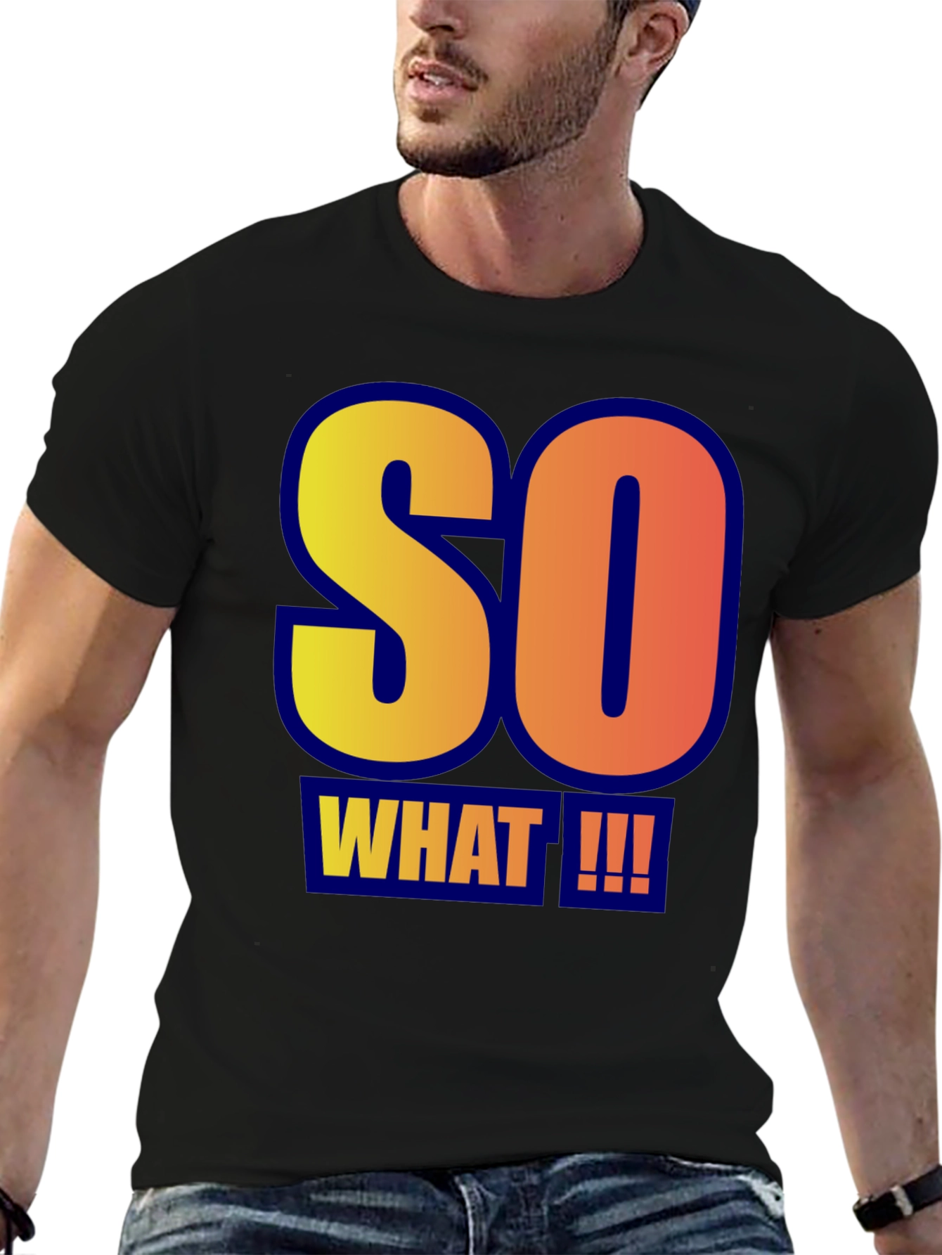 Make a statement with this eye-catching 'So What!!!' graphic tee. The vibrant yellow to orange gradient on the bold lettering pops against the classic black background. This casual t-shirt is made from comfortable, breathable fabric, perfect for everyday wear. The design is both playful and defiant, ideal for expressing your unique personality. Wear it out with friends, to a casual event, or simply while relaxing at home. Stand out from the crowd and show the world you don't sweat the small stuff with this confident and stylish t-shirt.