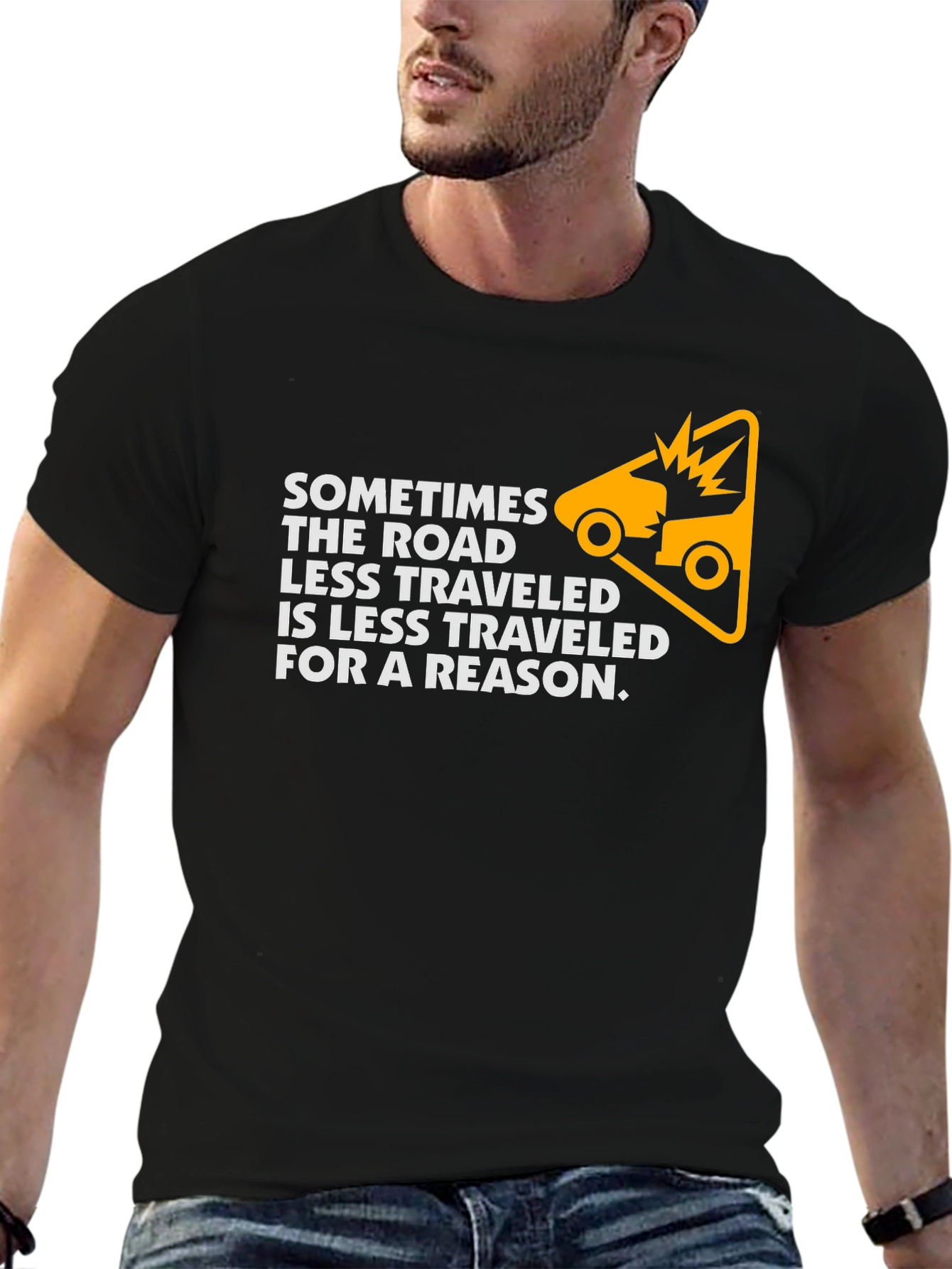 This black t-shirt features a funny design that's sure to get a laugh. The shirt reads, "Sometimes The Road Less Traveled Is Less Traveled For A Reason." Next to the words is a graphic depicting two cars in a collision. This tee is ideal for car enthusiasts, mechanics, drivers, or anyone who appreciates a good pun. The material looks to be a soft and breathable cotton blend, perfect for casual wear. A great gift idea for that friend or family member who loves cars!