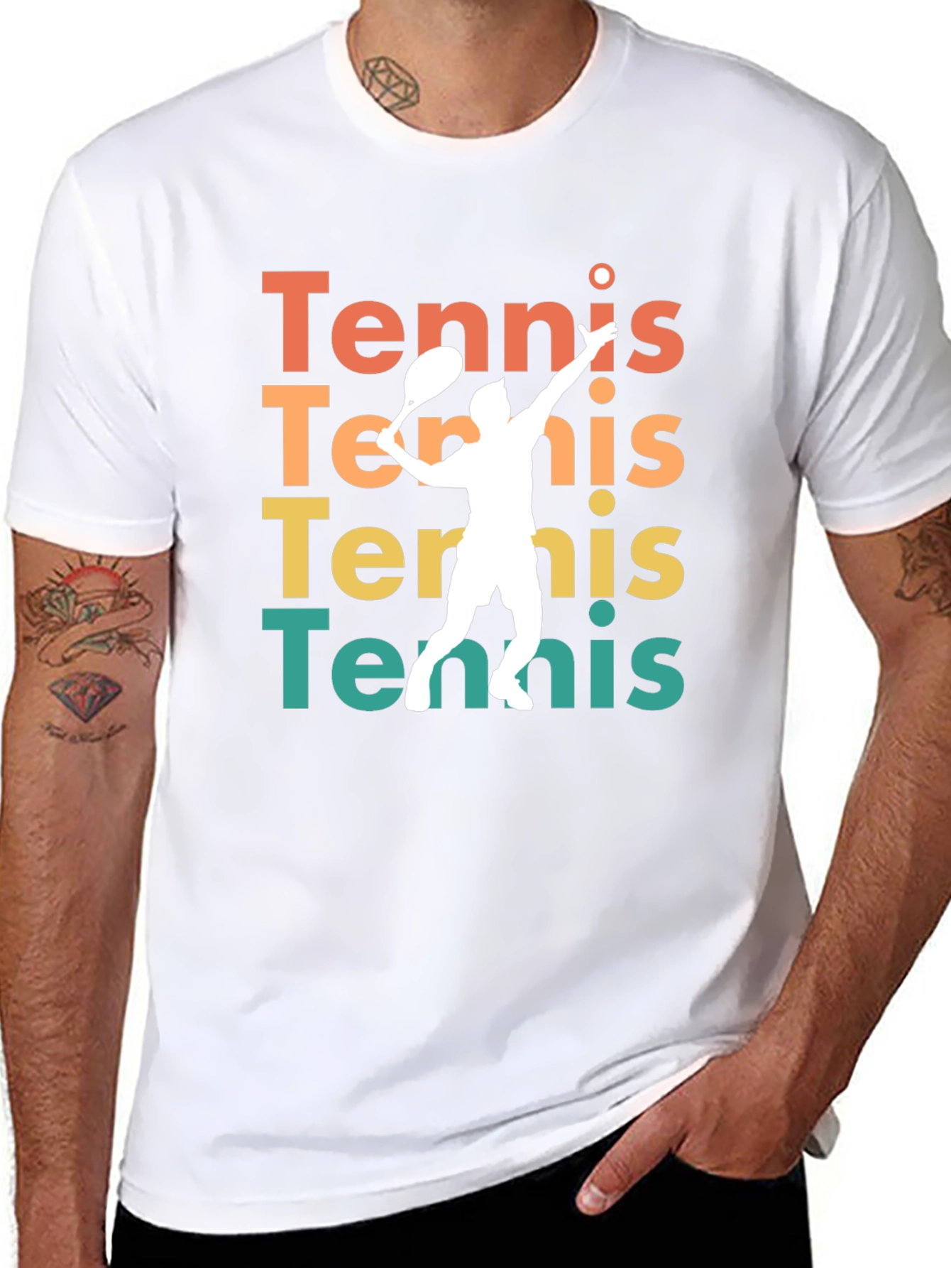 Serve up some style with this unique tennis-themed graphic tee! The black t-shirt features a vibrant, retro-inspired design with the word "Tennis" stacked in orange, peach, yellow, and teal. A white silhouette of a tennis player mid-serve adds a sporty touch. Made from comfortable fabric, this tee is perfect for casual wear, workouts, or showing off your love for the game. Pair it with jeans, shorts, or athletic wear for a cool, sporty look. The bold design ensures you'll stand out from the crowd both on and off the court.