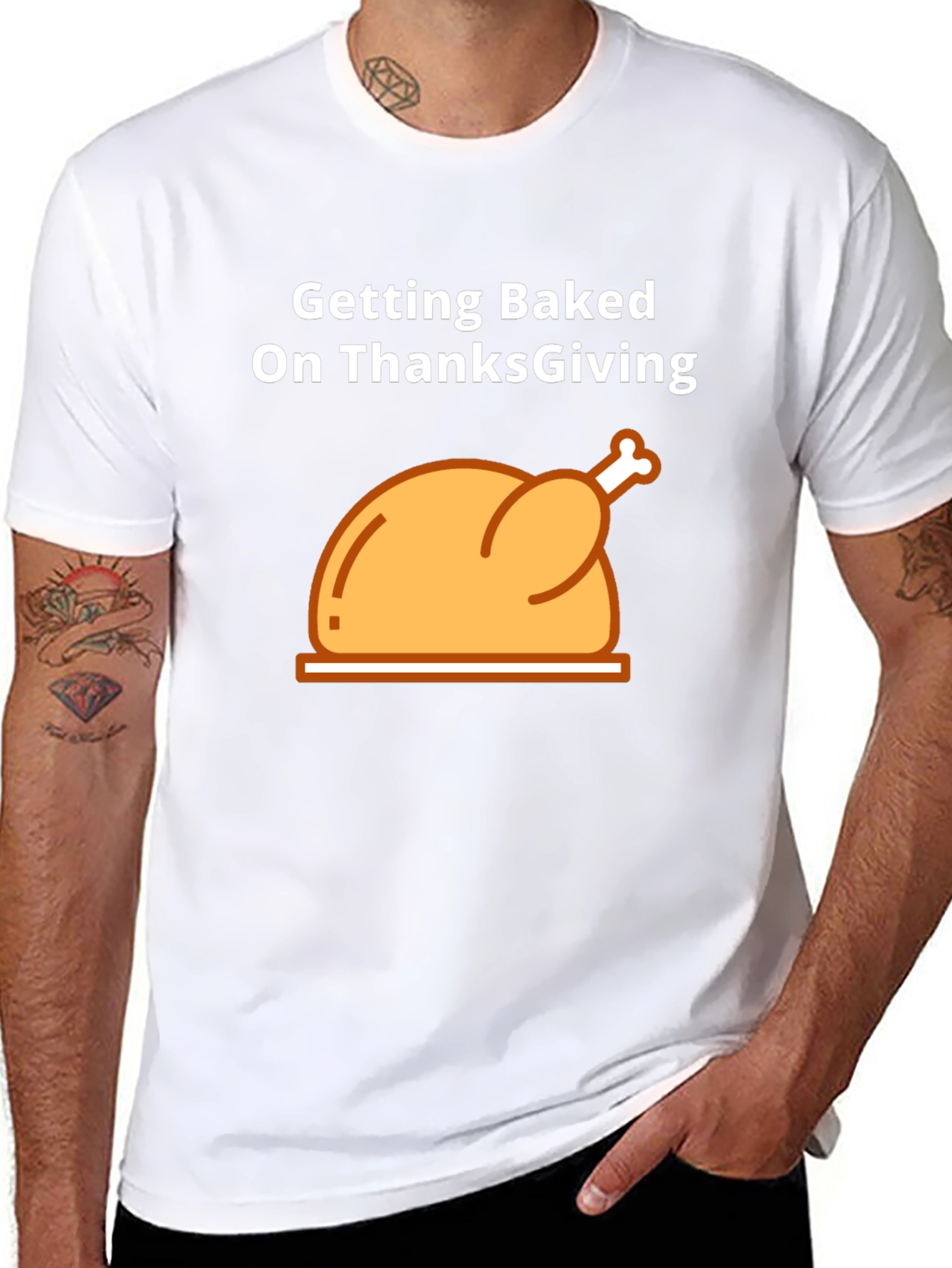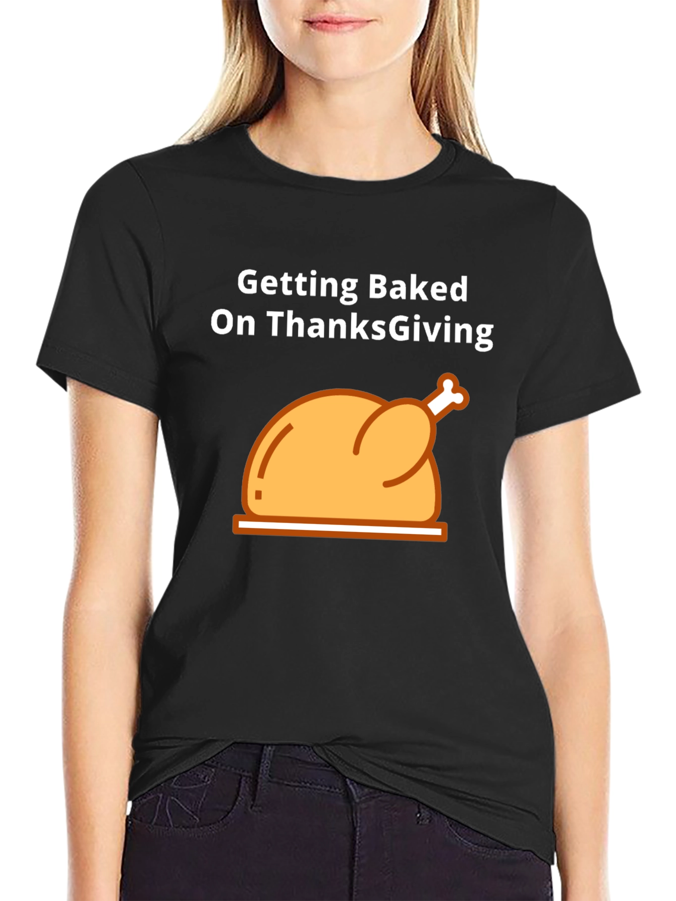 Celebrate Thanksgiving with this fun and festive black t-shirt. The design features a cartoon-style roasted turkey on a platter, alongside the humorous phrase "Getting Baked On Thanksgiving." Made from a soft, comfortable fabric, this t-shirt is perfect for casual wear during the holiday season. Show off your festive spirit and sense of humor at your Thanksgiving gathering or holiday parties. Makes a great gift for friends and family with a good sense of humor!