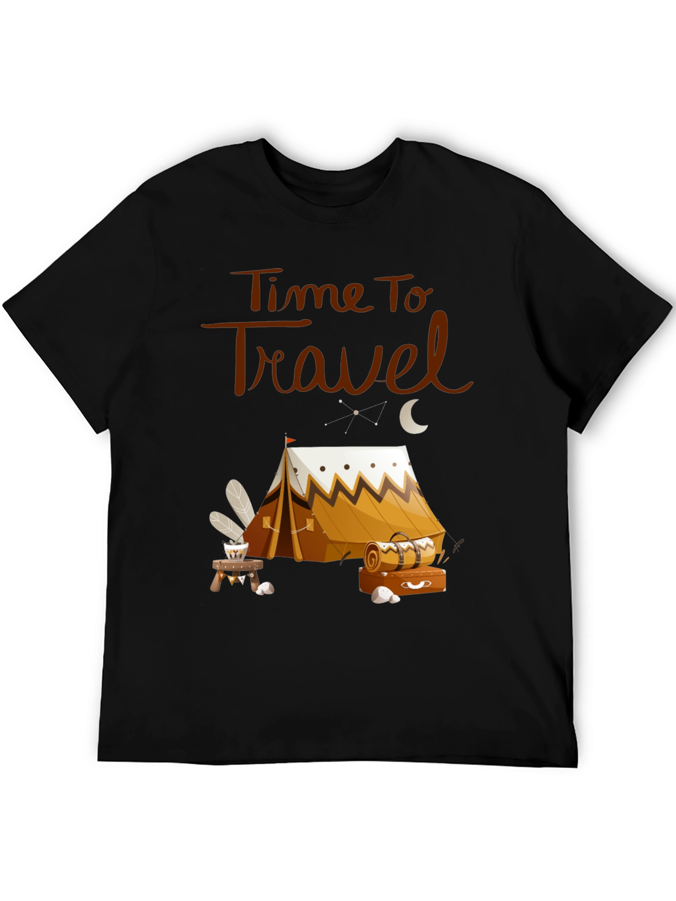 Embrace your wanderlust with this unique graphic tee! Featuring a charming illustration of a camping tent under a starry night sky, this shirt is perfect for anyone who loves to travel and explore. The words "Time To Travel" are printed above the graphic in a stylish brown font. The shirt itself appears to be made from a soft and comfortable black material, perfect for everyday wear or your next outdoor adventure. Show off your passion for travel with this eye-catching and comfortable tee! Great for casual outings, hiking, or simply lounging around.