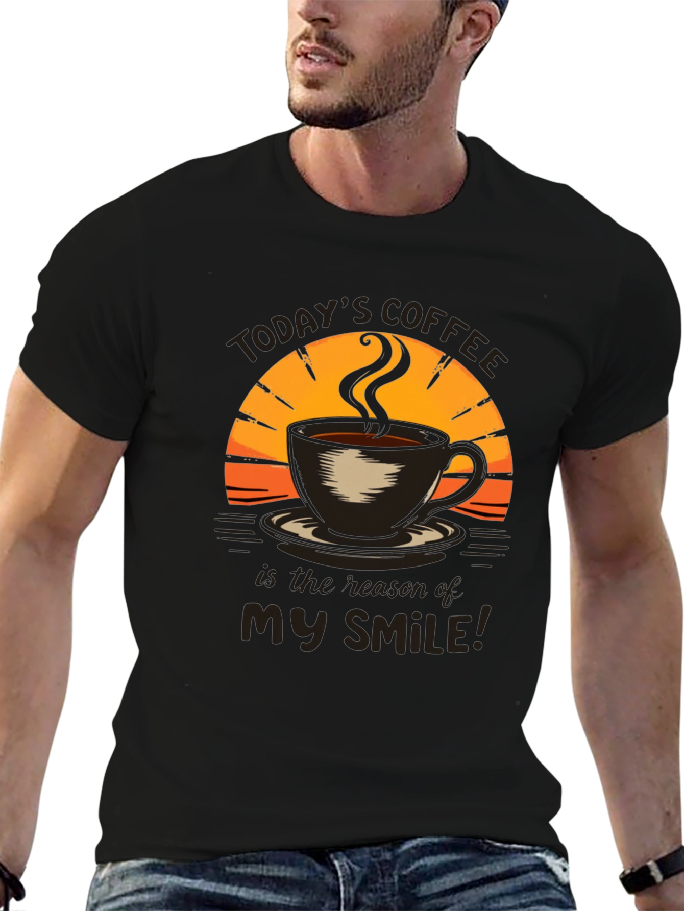 Indulge in your daily ritual with this stylish black t-shirt, featuring a captivating graphic print. The design showcases a steaming cup of coffee set against a vibrant sunrise, accompanied by the uplifting text "Today's Coffee is the Season of My Smile!" This comfortable tee is perfect for coffee lovers and anyone who appreciates a touch of positivity in their wardrobe. Crafted from soft, breathable fabric, it's ideal for casual wear, lounging at home, or expressing your love for coffee on your next outing. Elevate your everyday style with this unique and expressive t-shirt.