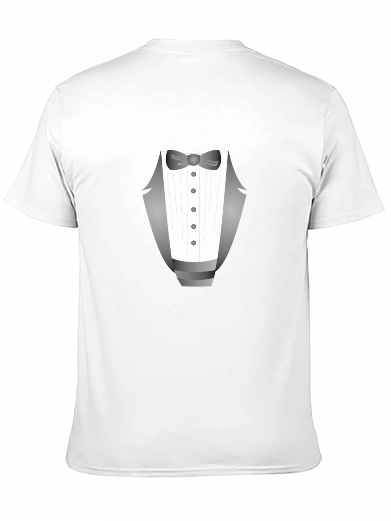 This black t-shirt offers a unique and playful twist on formal wear. The front features a detailed graphic of a tuxedo, complete with a bow tie and button-down shirt front. The design offers a fun, casual look. Crafted from a soft, breathable fabric, this shirt ensures comfort all day long. Perfect for parties, casual Fridays, or adding a touch of whimsy to your everyday style, this tuxedo tee is sure to turn heads and spark conversations. Pair it with jeans for a relaxed vibe or dress it up with chinos for a more polished ensemble.