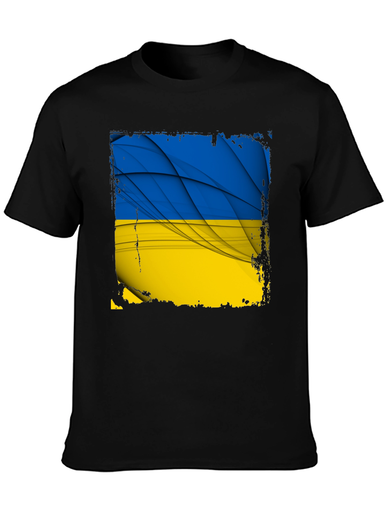 Show your support with this stylish black t-shirt featuring a bold graphic of the Ukrainian flag. The unique design incorporates flowing, abstract lines within the traditional blue and yellow colors, creating a modern and eye-catching look. Made from a comfortable material, this tee is perfect for everyday wear, rallies, or simply expressing your solidarity. Durable and easy to care for, it will quickly become a staple in your wardrobe. Available in various sizes.