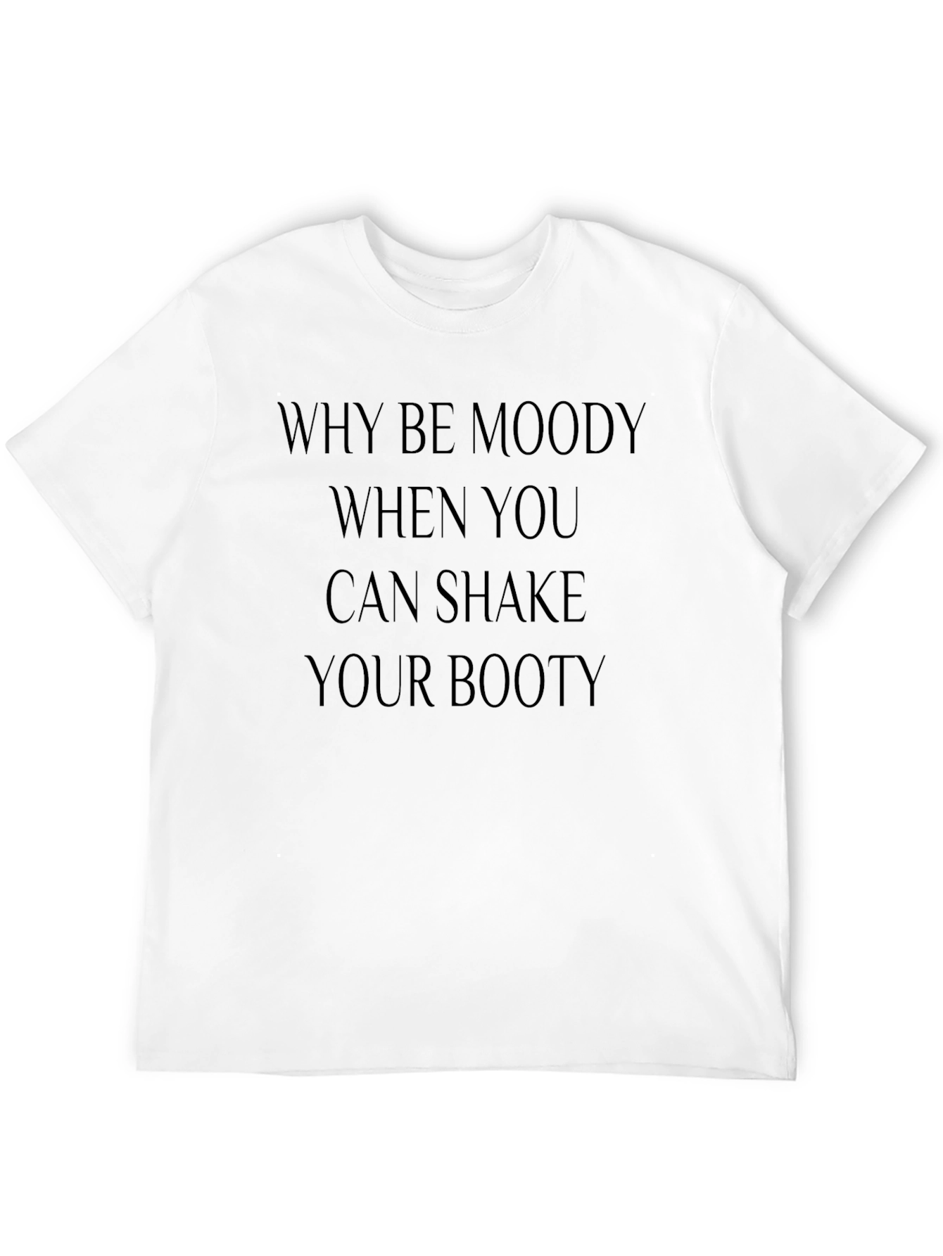 This stylish black t-shirt features a bold and humorous statement: "Why Be Moody When You Can Shake Your Booty." The casual fit and lightweight fabric make it perfect for everyday wear. The shirt's design is ideal for those who love to express their fun-loving personality through fashion. Whether you're heading to the gym, a casual outing, or just relaxing at home, this tee offers comfort and a touch of lightheartedness. The dark color and playful message ensure it pairs well with a variety of bottoms, making it a versatile addition to any wardrobe. Showcase your unique sense of humor with this eye-catching shirt.