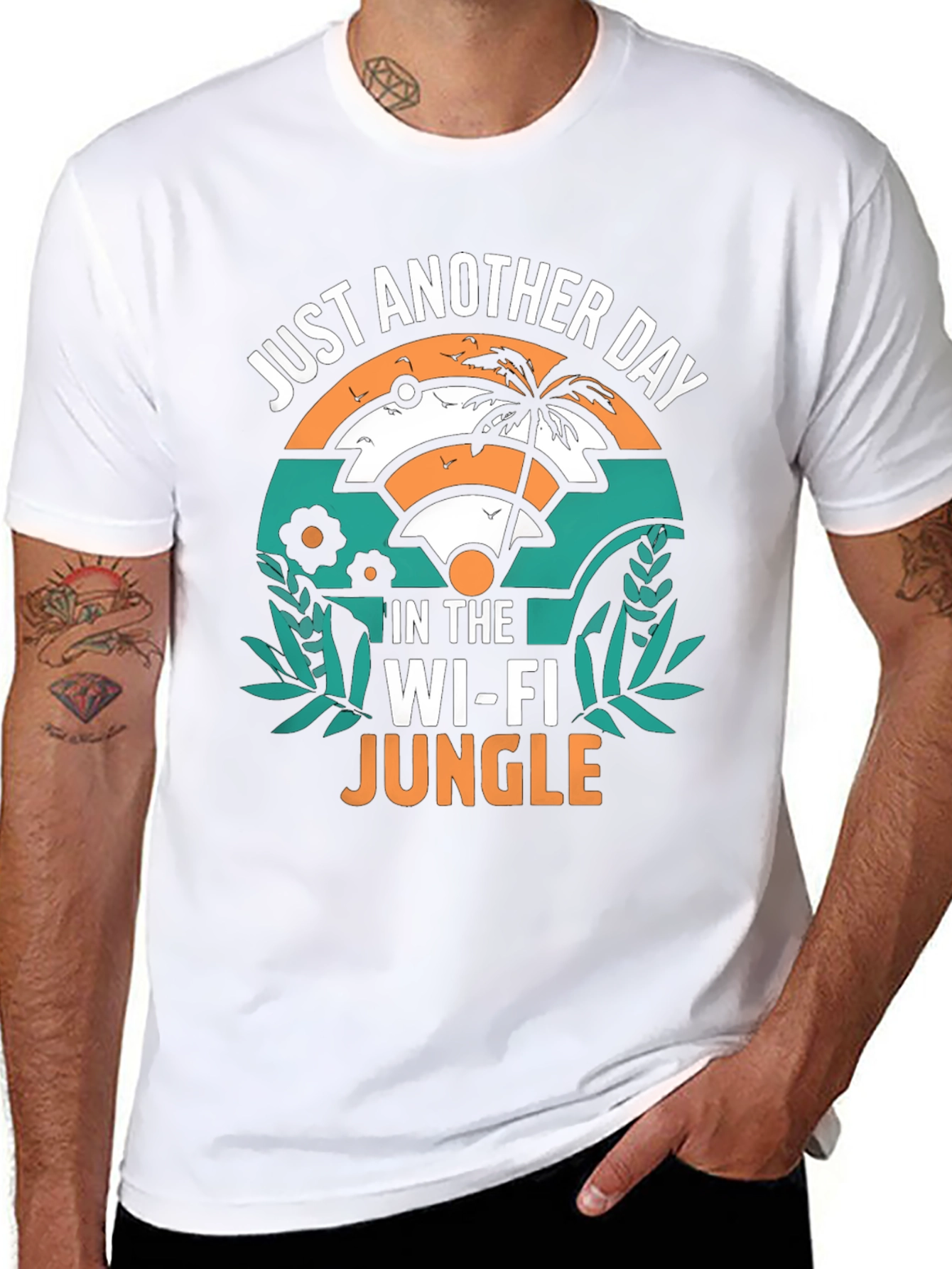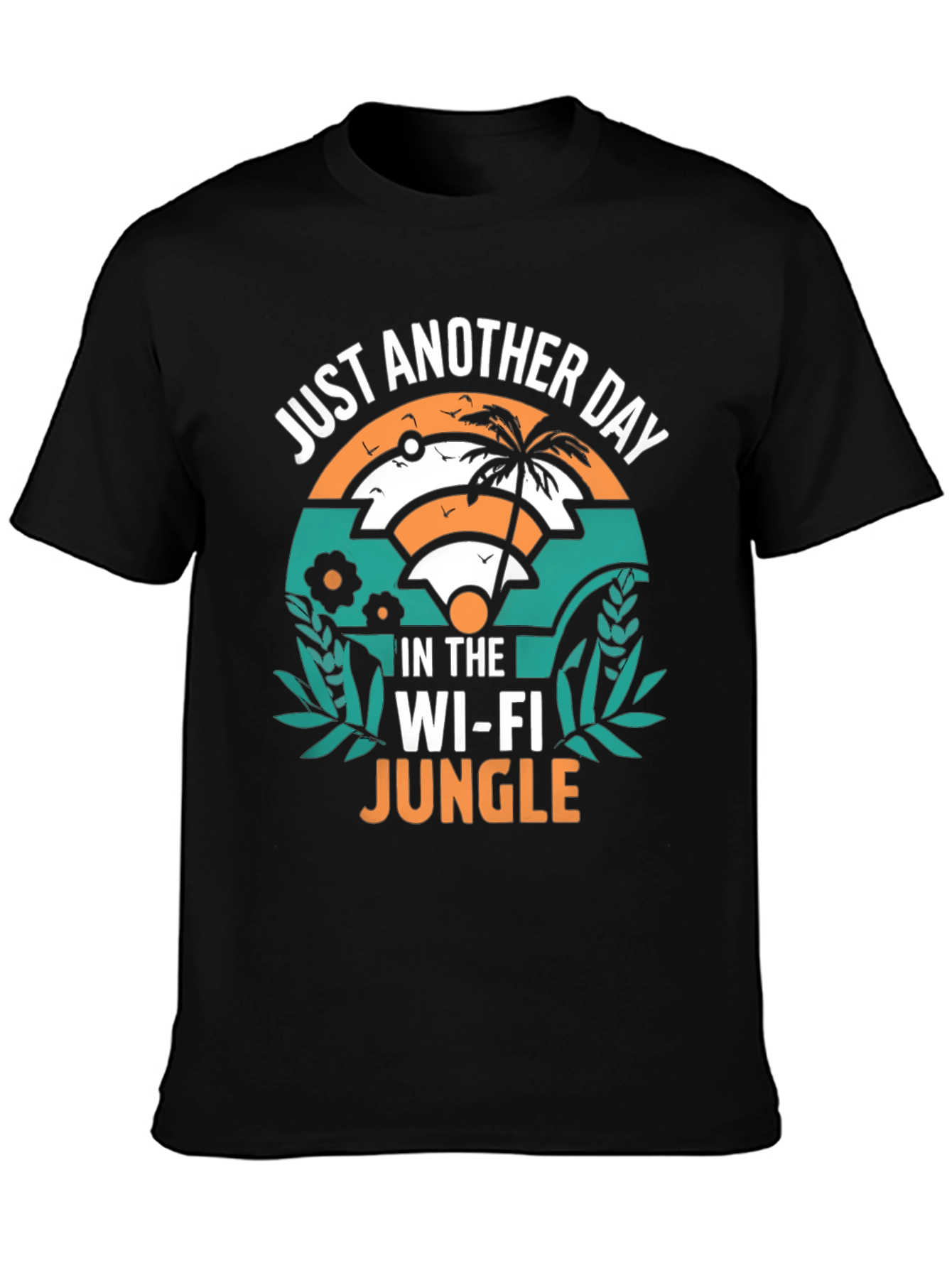 Escape the ordinary with this "Wi-Fi Jungle" T-shirt! Made from a comfortable black cotton blend, this tee features a vibrant, eye-catching graphic design. The creative artwork combines the universal Wi-Fi symbol with a tropical jungle scene, complete with palm trees and leafy accents. Perfect for tech enthusiasts, remote workers, or anyone with a sense of humor. Wear it casually or as a conversation starter at tech meetups. Add a touch of playful style to your wardrobe with this unique and comfortable tee!