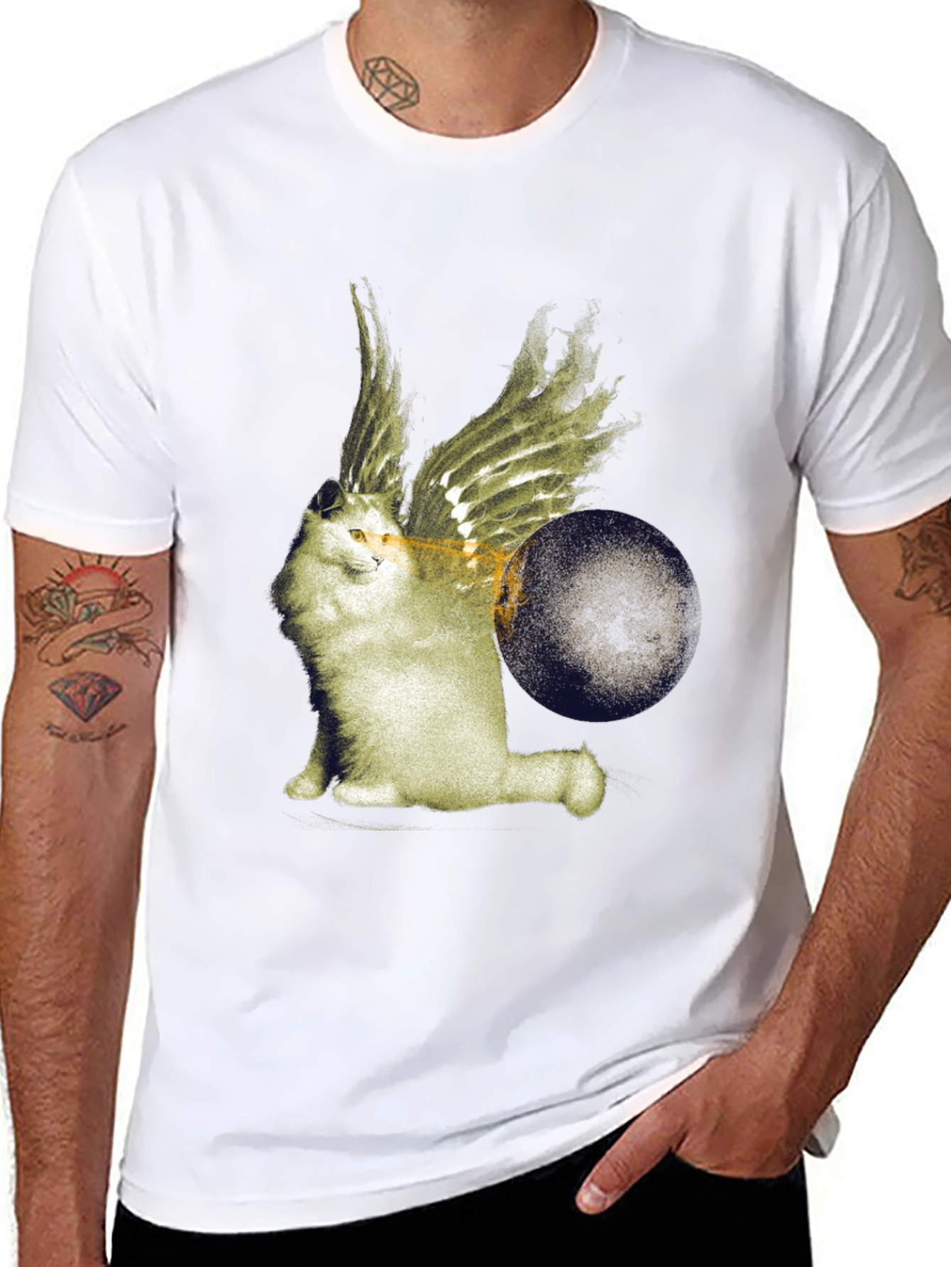 Show off your unique style with this eye-catching black tee! This shirt features a graphic of a fluffy white cat with golden wings and a dark circle. The striking contrast of the design against the black background makes it pop, while the comfortable fit ensures all-day wearability. Perfect for cat lovers or anyone who appreciates quirky, original art. Dress it up or down - this tee is versatile enough for casual outings, concerts, or just lounging at home. Grab yours today and let your personality shine!