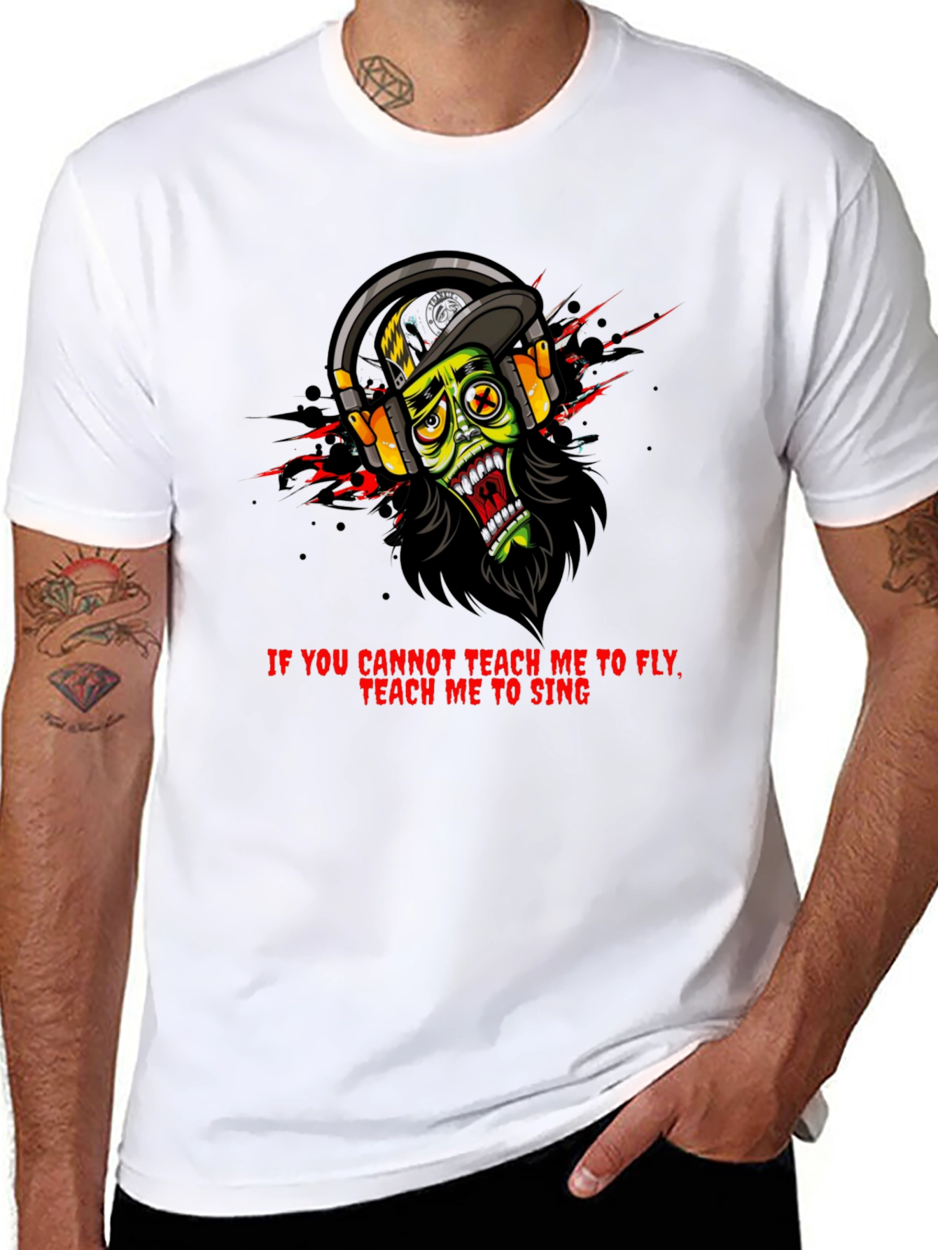 Show off your unique style with this bold black t-shirt. This striking tee features a cartoon zombie face wearing headphones. A catchy phrase about flying and singing is printed in red above the zombie. The graphic is surrounded by red splatters, adding a touch of edge. Made from comfortable fabric, this shirt is ideal for casual wear, concerts, or making a statement wherever you go. Pair it with jeans or shorts for a cool, laid-back look. Get yours today and rock your individuality!
